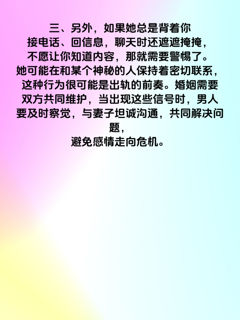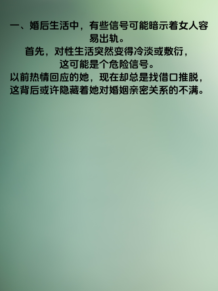 一、婚后生活中,有些信号可能暗示着女人容易出轨。首先,对性生活突然变得冷淡或敷衍,这可能是个危险信号。以前热情回应的她,现在却总是找借口推脱,这背后或许隐藏着她对婚姻亲密关系的不满。 二、再者,她开始频繁注重自己的外表,比以往更热衷于打扮,购买新衣服,花费大量时间在化妆和发型上。这可能不仅仅是为了取悦你,而是在吸引外界的目光,寻找新的情感寄托。 三、另外,如果她总是背着你接电话、回信息,聊天时还遮遮掩掩,不愿让你知道内容,那就需要警惕了。她可能在和某个神秘的人保持着密切联系,这种行为很可能是出轨的前奏。婚姻需要双方共同维护,当出现这些信号时,男人要及时察觉,与妻子坦诚沟通,共同解决问题,避免感情走向危机。