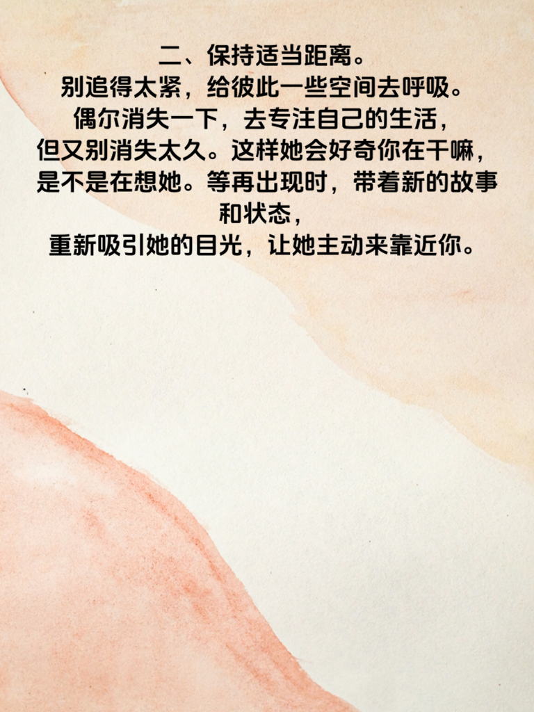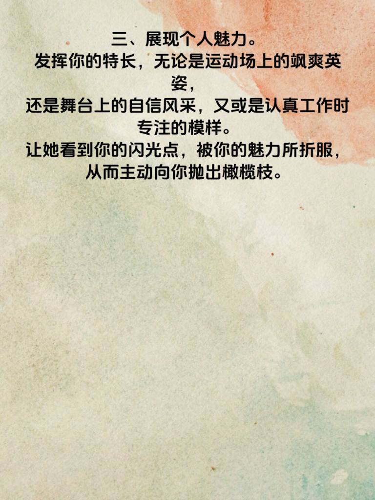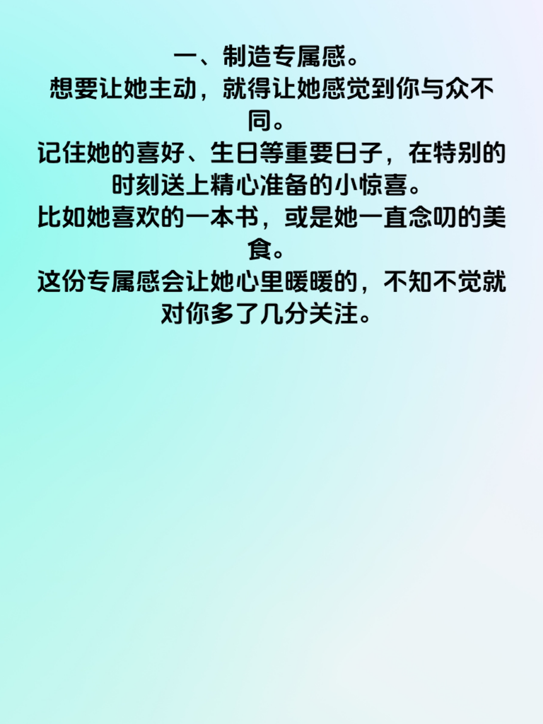 一、制造专属感。想要让她主动,就得让她感觉到你与众不同。记住她的喜好、生日等重要日子,在特别的时刻送上精心准备的小惊喜。比如她喜欢的一本书,或是她一直念叨的美食。这份专属感会让她心里暖暖的,不知不觉就对你多了几分关注。 二、保持适当距离。别追得太紧,给彼此一些空间去呼吸。偶尔消失一下,去专注自己的生活,但又别消失太久。这样她会好奇你在干嘛,是不是在想她。等再出现时,带着新的故事和状态,重新吸引她的目光,让她主动来靠近你。 三、展现个人魅力。发挥你的特长,无论是运动场上的飒爽英姿,还是舞台上的自信风采,又或是认真工作时专注的模样。让她看到你的闪光点,被你的魅力所折服,从而主动向你抛出橄榄枝。 四、巧妙沟通互动。聊天时别总是平淡无奇,用有趣的话题、幽默的语言来挑起她的兴趣。适当的小暧昧也必不可少,让她在和你交流中充满期待。当她对你的话题回应热烈,主动找你聊天时,你离成功就不远啦。