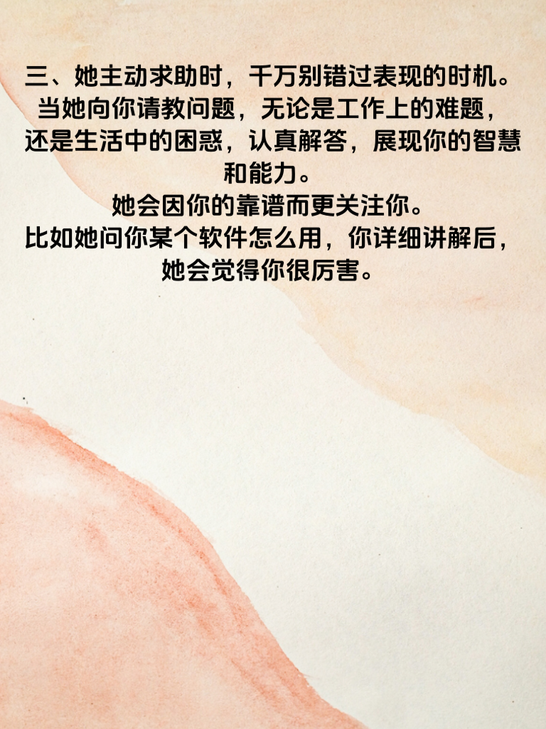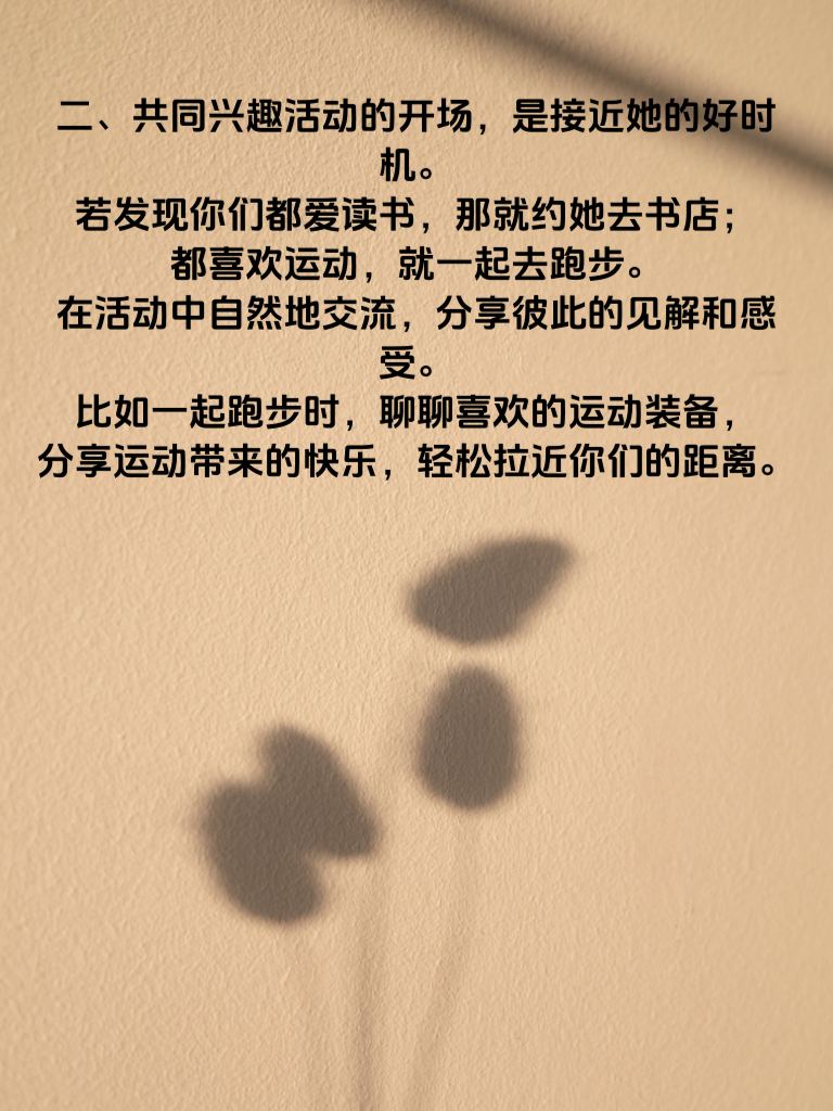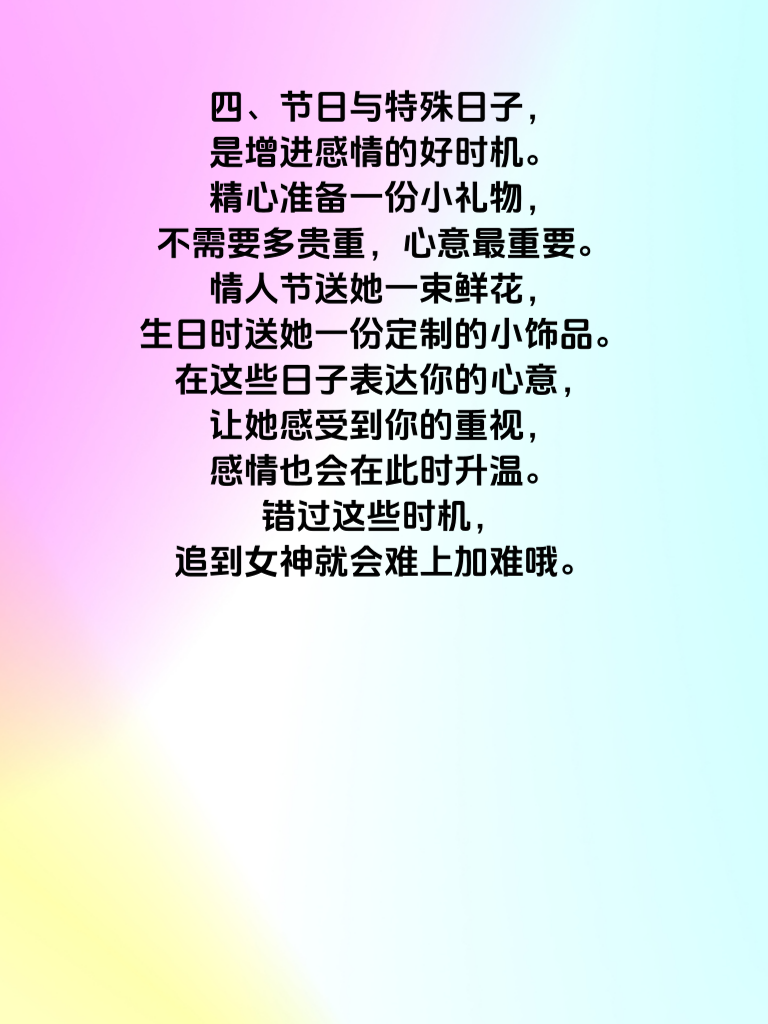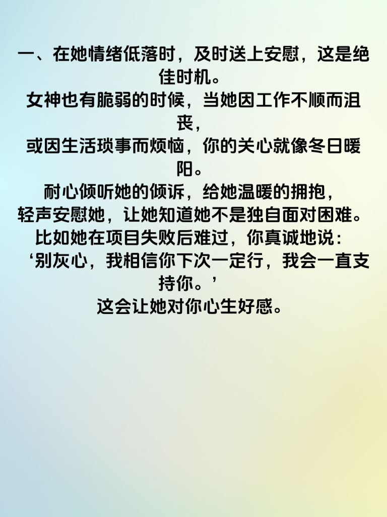 一、在她情绪低落时,及时送上安慰,这是绝佳时机。女神也有脆弱的时候,当她因工作不顺而沮丧,或因生活琐事而烦恼,你的关心就像冬日暖阳。耐心倾听她的倾诉,给她温暖的拥抱,轻声安慰她,让她知道她不是独自面对困难。比如她在项目失败后难过,你真诚地说:‘别灰心,我相信你下次一定行,我会一直支持你。’这会让她对你心生好感。 二、共同兴趣活动的开场,是接近她的好时机。若发现你们都爱读书,那就约她去书店;都喜欢运动,就一起去跑步。在活动中自然地交流,分享彼此的见解和感受。比如一起跑步时,聊聊喜欢的运动装备,分享运动带来的快乐,轻松拉近你们的距离。 三、她主动求助时,千万别错过表现的时机。当她向你请教问题,无论是工作上的难题,还是生活中的困惑,认真解答,展现你的智慧和能力。她会因你的靠谱而更关注你。比如她问你某个软件怎么用,你详细讲解后,她会觉得你很厉害。 四、节日与特殊日子,是增进感情的好时机。精心准备一份小礼物,不需要多贵重,心意最重要。情人节送她一束鲜花,生日时送她一份定制的小饰品。在这些日子表达你的心意,让她感受到你的重视,感情也会在此时升温。错过这些时机,追到女神就会难上加难哦。
