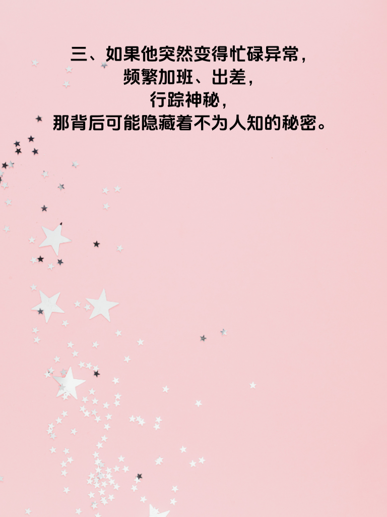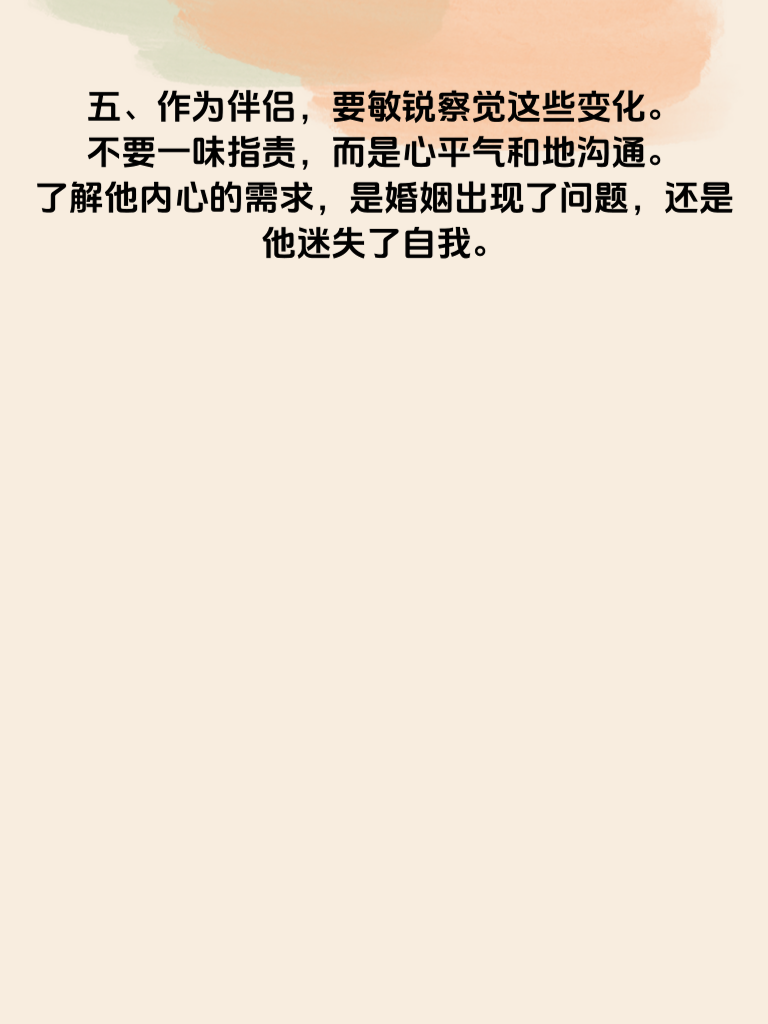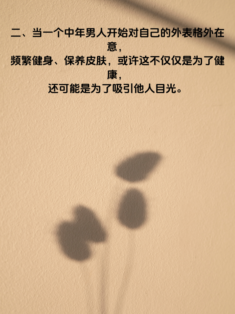 一、中年男人,在生活的磨砺中,往往容易陷入情感的漩涡。中年男易出轨,身体会报警,这并非危言耸听。 二、当一个中年男人开始对自己的外表格外在意,频繁健身、保养皮肤,或许这不仅仅是为了健康,还可能是为了吸引他人目光。 三、如果他突然变得忙碌异常,频繁加班、出差,行踪神秘,那背后可能隐藏着不为人知的秘密。 四、还有一些细节,比如他开始注重穿着打扮,对新潮流趋之若鹜,手机不离身且总是回避他人视线查看,这些都可能是身体发出的出轨信号。 五、作为伴侣,要敏锐察觉这些变化。不要一味指责,而是心平气和地沟通。了解他内心的需求,是婚姻出现了问题,还是他迷失了自我。 六、同时,也要审视自身,是否在生活中忽略了他。婚姻是一场长久的旅程,需要双方共同呵护,及时修补可能出现的裂缝,才能避免中年情感危机的爆发。