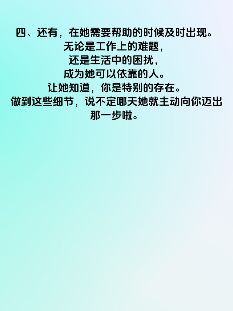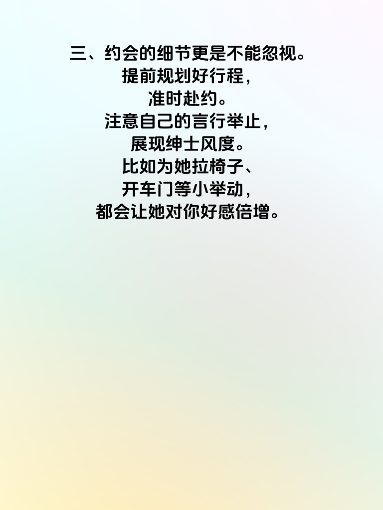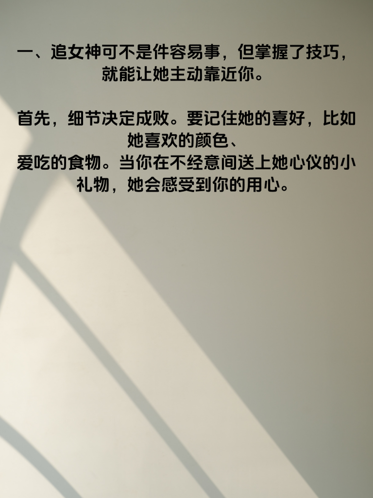 一、追女神可不是件容易事,但掌握了技巧,就能让她主动靠近你。首先,细节决定成败。要记住她的喜好,比如她喜欢的颜色、爱吃的食物。当你在不经意间送上她心仪的小礼物,她会感受到你的用心。 二、聊天时也是关键。认真倾听她说话,给予积极回应,让她觉得自己被重视。不要总是自说自话,适时分享有趣的事,引发共鸣。 三、约会的细节更是不能忽视。提前规划好行程,准时赴约。注意自己的言行举止,展现绅士风度。比如为她拉椅子、开车门等小举动,都会让她对你好感倍增。 四、还有,在她需要帮助的时候及时出现。无论是工作上的难题,还是生活中的困扰,成为她可以依靠的人。让她知道,你是特别的存在。做到这些细节,说不定哪天她就主动向你迈出那一步啦。