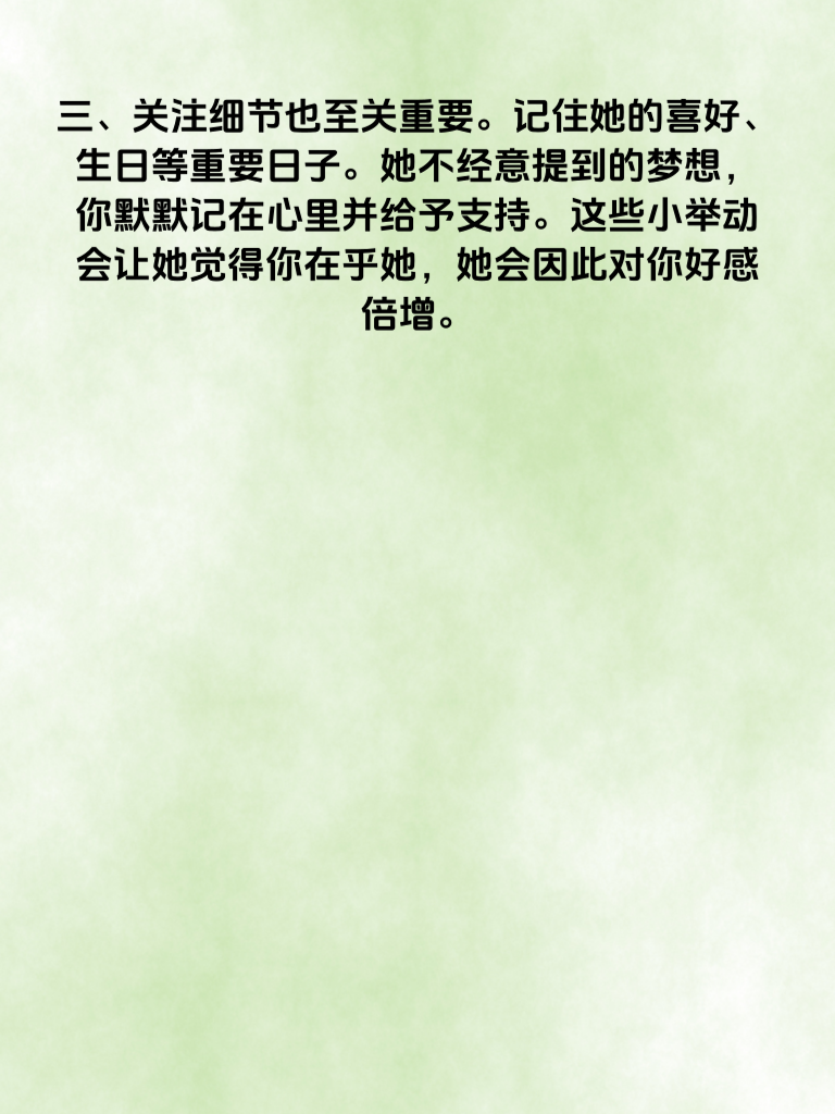 一、在情场中,想要收获美满爱情,让心仪的她主动来电是关键一步。而这其中,诸多细节起着决定性作用。 二、首先,真诚是必杀技。真诚对待她,不做作、不伪装,让她感受到你最真实的一面。比如,分享自己的喜怒哀乐,在她面前展现脆弱与坚强,这会让她觉得你信任她,从而拉近彼此距离。 三、关注细节也至关重要。记住她的喜好、生日等重要日子。她不经意提到的梦想,你默默记在心里并给予支持。这些小举动会让她觉得你在乎她,她会因此对你好感倍增。 四、聊天时,学会倾听。不要急于表达自己,耐心听她倾诉,适时给予回应和理解。让她在你这里找到倾诉的港湾,她自然会更愿意与你交流,甚至主动找你分享生活点滴。 五、还有,保持自身的魅力。不断提升自己,无论是内在修养还是外在形象。当你变得优秀且有吸引力时,她会被你深深吸引,主动向你靠近,主动给你来电。