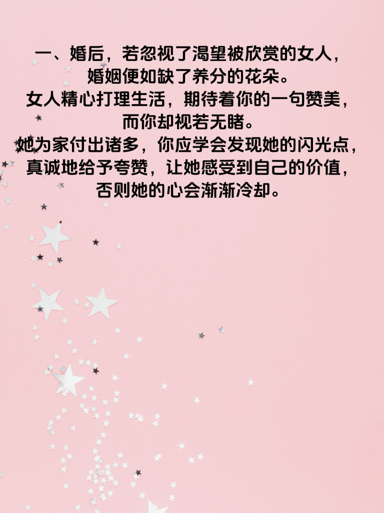 一、婚后,若忽视了渴望被欣赏的女人,婚姻便如缺了养分的花朵。女人精心打理生活,期待着你的一句赞美,而你却视若无睹。她为家付出诸多,你应学会发现她的闪光点,真诚地给予夸赞,让她感受到自己的价值,否则她的心会渐渐冷却。 二、那些被冷落的情感需求,如同婚姻里的暗礁。女人细腻敏感,渴望与你分享喜怒哀乐,渴望你的陪伴与倾听。你若总是忙碌而忽略她,她会觉得自己被置于角落。每天抽出时间,用心聆听她的心事,参与她的生活点滴,才能让情感的纽带更加牢固。 三、忽视女人对自我成长的追求,是给婚姻埋下隐患。她有着自己的梦想与追求,希望在婚后也能不断提升自我。支持她去学习、去进步,而不是泼冷水。当她在成长中绽放光彩,婚姻也会充满活力。反之,她可能因被束缚而心生不满,导致离婚率飙升。婚后,请珍视这三种女人,用心经营,婚姻才能长久幸福。