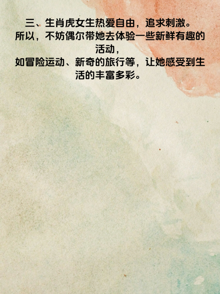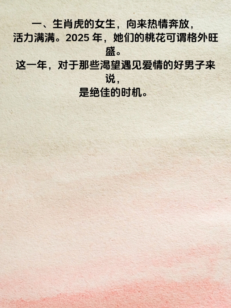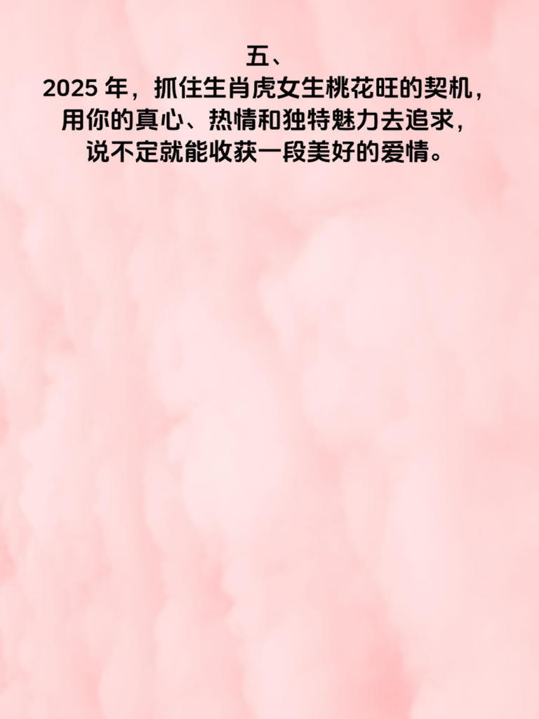 一、生肖虎的女生,向来热情奔放,活力满满。2025年,她们的桃花可谓格外旺盛。这一年,对于那些渴望遇见爱情的好男子来说,是绝佳的时机。 二、想要追求生肖虎女生,真诚是首要秘诀。她们不喜欢虚情假意,真心才能打动她们的心。在日常相处中,要坦率地表达自己的想法和感受。 三、生肖虎女生热爱自由,追求刺激。所以,不妨偶尔带她去体验一些新鲜有趣的活动,如冒险运动、新奇的旅行等,让她感受到生活的丰富多彩。 四、她们性格直爽,讨厌拐弯抹角。与她们交流时,直接明了的沟通方式会更受青睐。不要在小事上计较,展现出你的大度和包容。 五、2025年,抓住生肖虎女生桃花旺的契机,用你的真心、热情和独特魅力去追求,说不定就能收获一段美好的爱情。