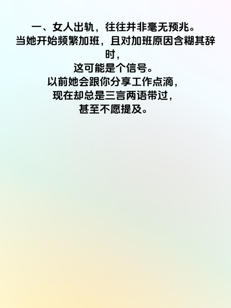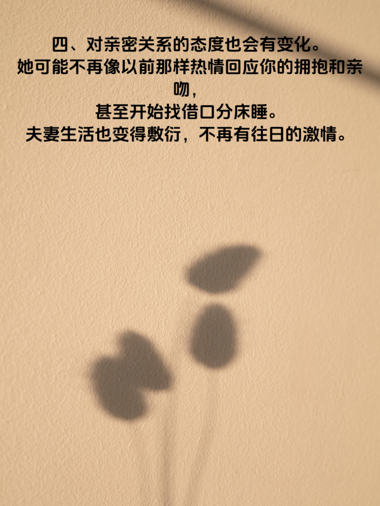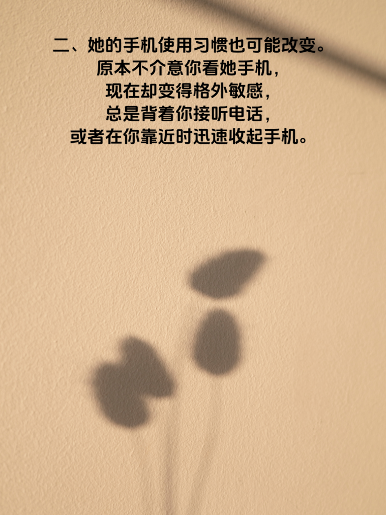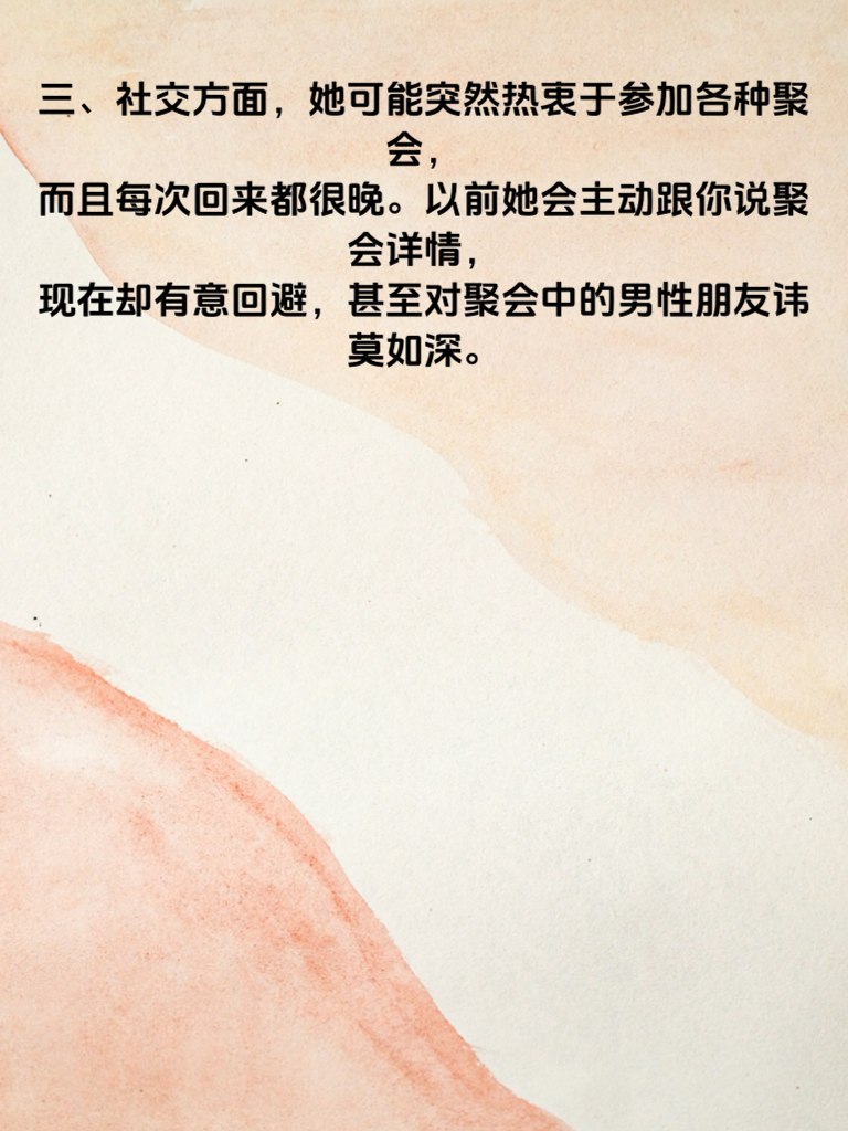 一、女人出轨,往往并非毫无预兆。当她开始频繁加班,且对加班原因含糊其辞时,这可能是个信号。以前她会跟你分享工作点滴,现在却总是三言两语带过,甚至不愿提及。 二、她的手机使用习惯也可能改变。原本不介意你看她手机,现在却变得格外敏感,总是背着你接听电话,或者在你靠近时迅速收起手机。 三、社交方面,她可能突然热衷于参加各种聚会,而且每次回来都很晚。以前她会主动跟你说聚会详情,现在却有意回避,甚至对聚会中的男性朋友讳莫如深。 四、对亲密关系的态度也会有变化。她可能不再像以前那样热情回应你的拥抱和亲吻,甚至开始找借口分床睡。夫妻生活也变得敷衍,不再有往日的激情。 五、如果发现她这些行为有明显改变,不要立刻指责,而是冷静沟通。问问她最近的感受,表达你对她的关心。也许只是生活压力让她有了变化,及时沟通能避免误会升级。