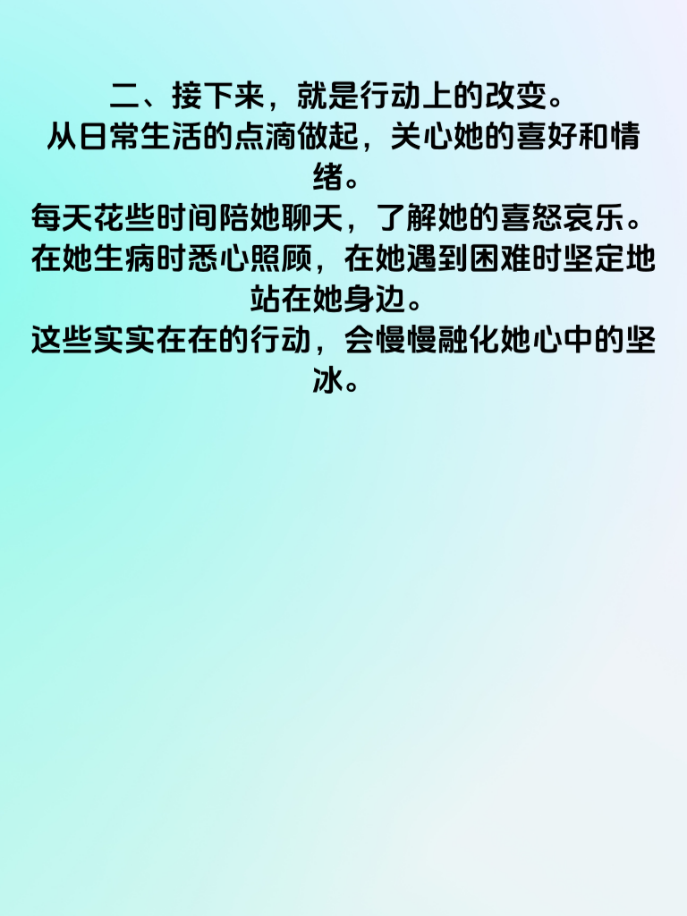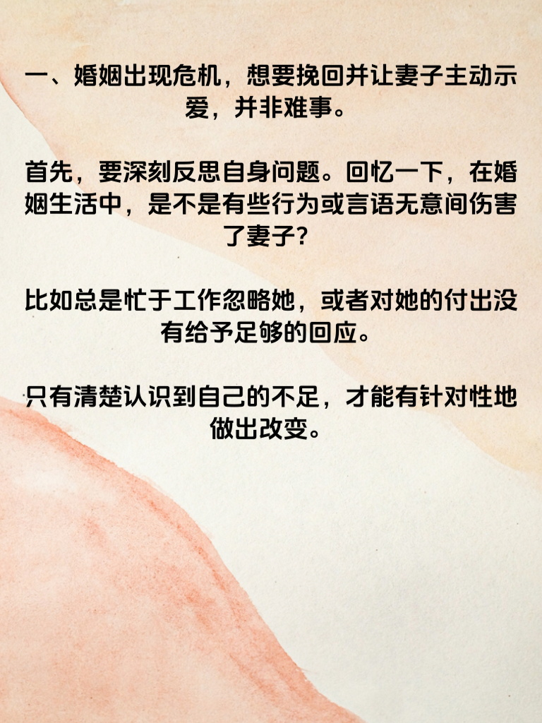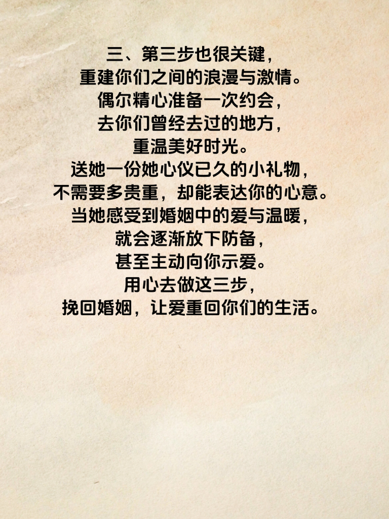 一、婚姻出现危机,想要挽回并让妻子主动示爱,并非难事。首先,要深刻反思自身问题。回忆一下,在婚姻生活中,是不是有些行为或言语无意间伤害了妻子?比如总是忙于工作忽略她,或者对她的付出没有给予足够的回应。只有清楚认识到自己的不足,才能有针对性地做出改变。 二、接下来,就是行动上的改变。从日常生活的点滴做起,关心她的喜好和情绪。每天花些时间陪她聊天,了解她的喜怒哀乐。在她生病时悉心照顾,在她遇到困难时坚定地站在她身边。这些实实在在的行动,会慢慢融化她心中的坚冰。 三、第三步也很关键,重建你们之间的浪漫与激情。偶尔精心准备一次约会,去你们曾经去过的地方,重温美好时光。送她一份她心仪已久的小礼物,不需要多贵重,却能表达你的心意。当她感受到婚姻中的爱与温暖,就会逐渐放下防备,甚至主动向你示爱。用心去做这三步,挽回婚姻,让爱重回你们的生活。