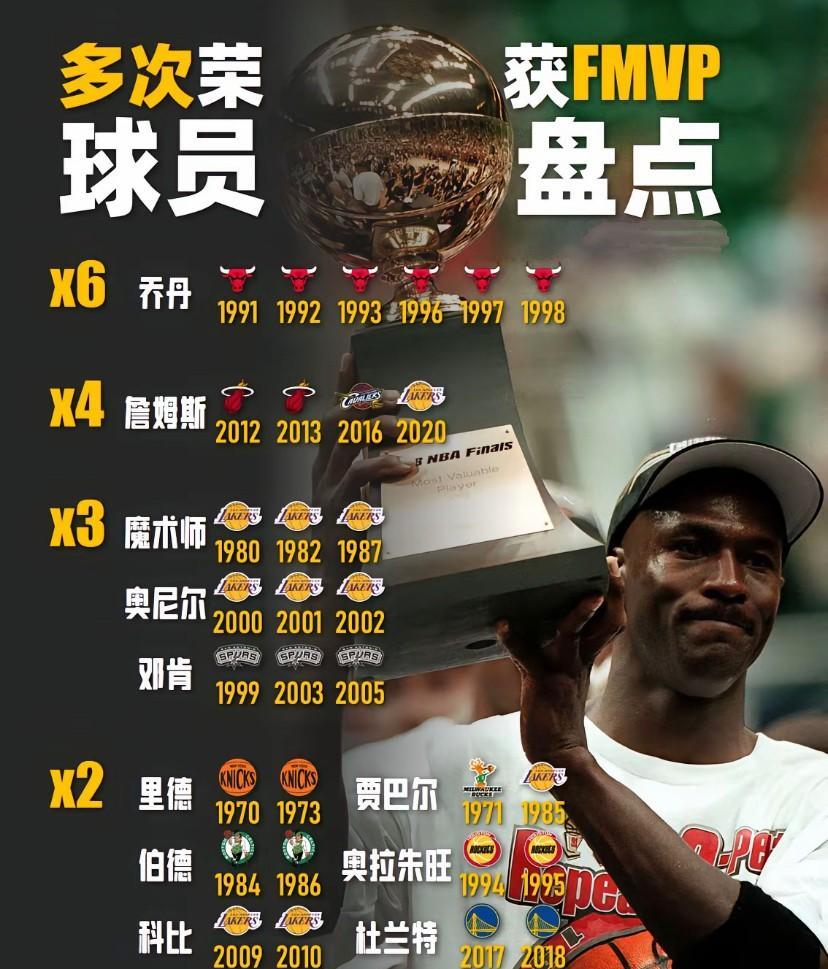 NBA历史上有不少超强的FMVP。乔丹肯定是绕不开的,他6次夺冠6获FMVP,技