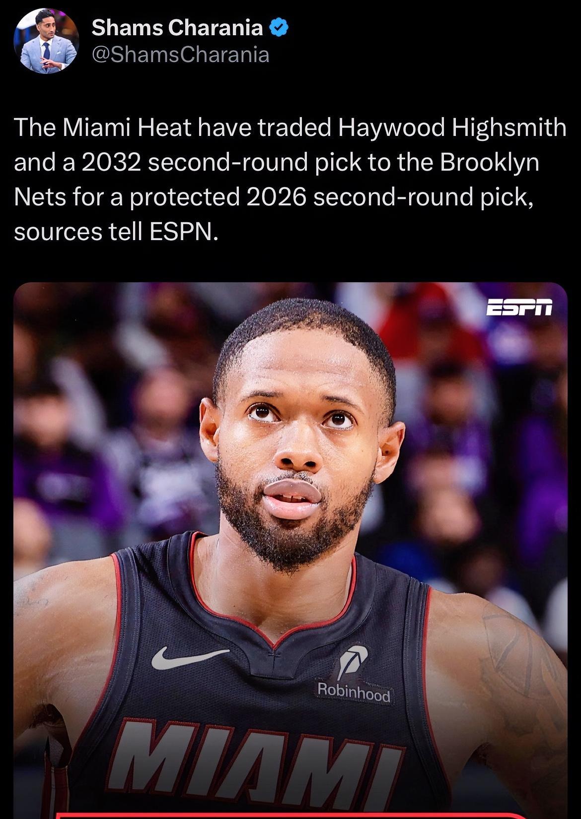据shams报道:消息人士告诉ESPN,热火将海史密斯和2032年第二轮选秀权交