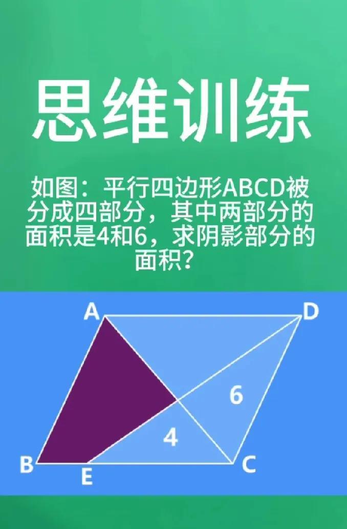 小学数学思维题!平行四边形分割,4和6的面积,阴影咋算?