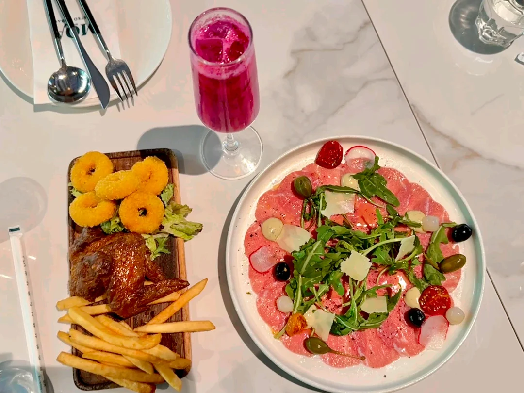 🌈终于打卡超火的MQA BISTRO&BAR!环境很nice,店里氛围感拉满,太适合拍照了! 🌈和姐妹还有姐妹的朋友们一起点的每道菜都像艺术品🍽️,摆盘精致到不忍心下口!哈哈哈! 🌈味道也还可以,食材新鲜,酱汁惊艳~随手一拍都是大片!虽然我今天点的饮料并没有很好喝,但是冲着人均100r漂亮饭的颜值和闺蜜聚一聚,还是很值得冲!💖