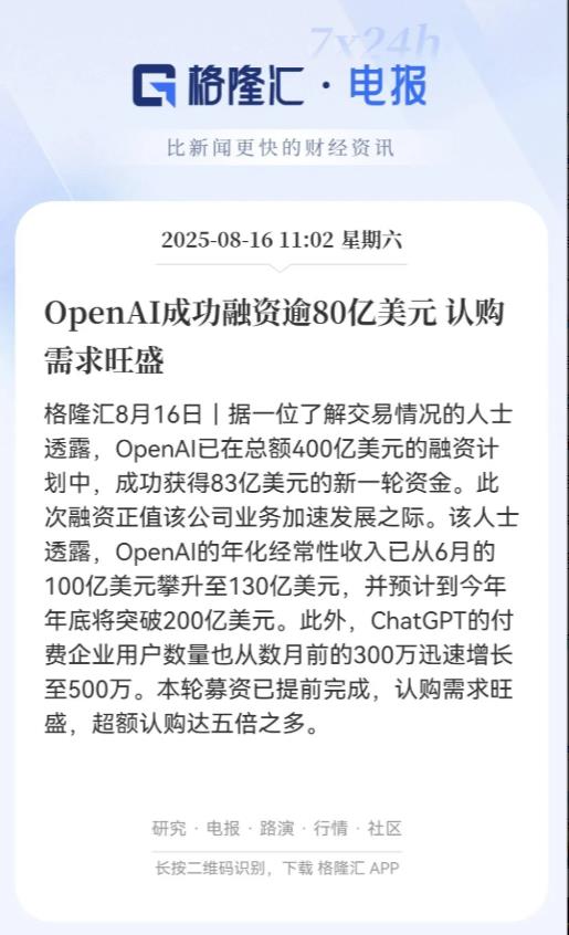 OpenAI也太牛了吧!又搞到83亿美元融资,投资人抢着送钱,原本计划募400亿,结果认购火爆到超额五倍,跟不要钱似的,这公司现在就是AI界的当红炸子鸡,收入三个月涨了30亿,年底要冲200亿,ChatGPT企业用户也从300万飙到500万,增长速度比坐火箭还快!
