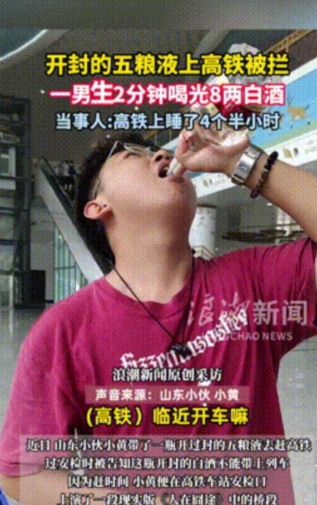 “这也太狠了!”一山东小伙赶高铁时,因为携带的五粮液已经开封,没法带到列车上!为了不浪费,小伙进站前猛喝白酒,仅2分钟就喝了8两!结果刚上列车不久,小伙就开始呼呼大睡,一下就睡了4个半小时!网友:现实版人在囧途! 山东有个 23 岁的小伙,前些天赶高铁时闹出的事,在网上传得人尽皆知,他带了瓶五粮液,还是已经开封的,到了盐城高铁站安检口,工作人员说开封的酒不能带上车,这可把他难住了,那酒快一千块呢,扔了舍不得带又带不走。 没咋犹豫,小伙干脆来了个 “硬核操作”,站在安检口跟前,拧开瓶盖就往嘴里灌,旁边朋友看得愣,顺手拿手机拍了下来,就这短短两分钟,瓶里剩下的八两白酒,愣是被他一口气喝光了。 朋友后来把视频发出去,不少人瞅着直咋舌,有人说他 “够性情”,也有人笑:“这不是现实版《人在囧途》嘛,跟王宝强那喝牛奶的戏码似的。” 可笑着笑着没人觉得轻松了,他刚上高铁没多久,就靠着座位呼呼睡过去了,这一睡就是四个半小时,中间咋叫都没咋醒,旁人看着都捏把汗,哪是啥 “酣睡”,分明是喝懵了。 其实按铁路的规矩,白酒要带上车,得密封好、标签清楚,度数和总量也有讲究,核心就是 “没开封”,有人可能觉得这规矩死性,可换个角度想,安检员哪能一眼辨清开封的瓶子里装的是酒还是别的啥? 万一有易燃易爆的东西混进来,整车厢人的安全都悬着,所以这规矩看着冷,其实是护着大伙儿呢,就是这规矩跟前,小伙选了最冒险的法子。 他估摸没细想,八两 52 度的白酒,短时间灌进肚子里有多吓人,换算成纯酒精量真不少,人猛地喝这么多,很容易急性酒精中毒,血液里酒精浓度一飙高,人很快就迷糊了,这可不是 “喝多了睡一觉” 的事,是神经和脏器都在受折腾。 更怕人的是藏在醉酒背后的风险,人喝到昏迷要是吐了,呕吐物呛进气管,轻了得肺炎,重了可能当场窒息。 而且酒精还可能让人低血糖,对身体的损伤没准是不可逆的,像心梗、胃出血这些急症,都可能跟着来。 所以他在高铁上睡的那四个半小时,根本没旁人想的安稳,就是没医护盯着,跟死神赌了一把,最后能醒过来纯属万幸。 好多人把这事往《人在囧途》上靠,电影里王宝强喝牛奶是逗乐,可那是演的啊,王宝强自己后来也说过,拍那场戏喝得反胃,后来见了牛奶都犯怵。 真把电影里的夸张桥段搬到现实里,还当成 “潇洒”,实在是对自己不负责,早几年不就有在机场喝几升牛奶的,跟这次小伙猛灌白酒一样,看着 “不浪费”,实则是拿健康开玩笑。 说到底,遇着规矩卡壳,犯不着跟自己较劲。 也算是给大伙儿提个醒吧,规矩在那儿,不是让人硬碰硬的,冷静想想办法总比冲动行事强,毕竟不管那酒多贵,也比不上自己的身子骨金贵,安安稳稳到站比啥都强,你说是不是这个理? (信息来源:光明网——男生带已开封的五粮液上高铁被拦当场喝完!12306回应)