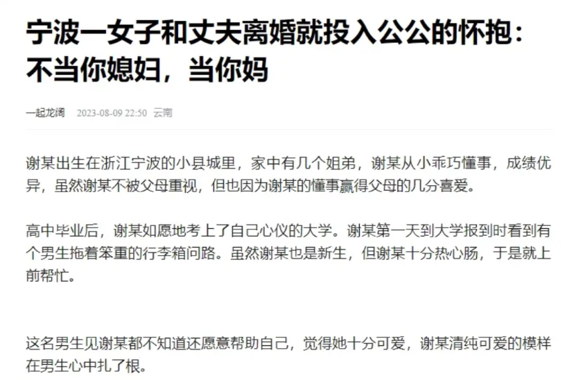 这个故事发生在浙江宁波的一个普通小区里。女的叫谢某,她丈夫李某是做生意的,家里条件还行。两人结婚多年,生了个女儿。李某在外头挣钱,谢某在家带孩子,顺便帮着家里的一些事。谢某人老实,不爱多话,但把家打理得井井有条。公公老李,老伴早没了,一个人把儿子拉扯大,吃了不少苦。他对谢某挺满意,因为她顾家,孩子照顾得好。
