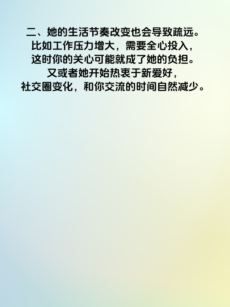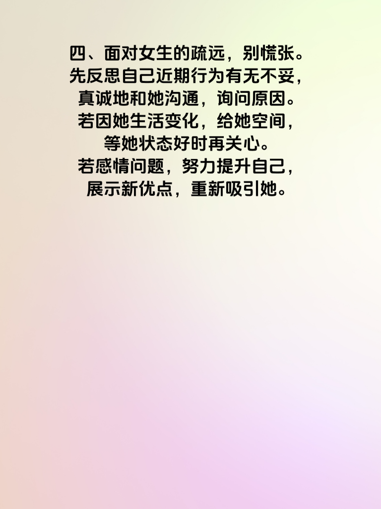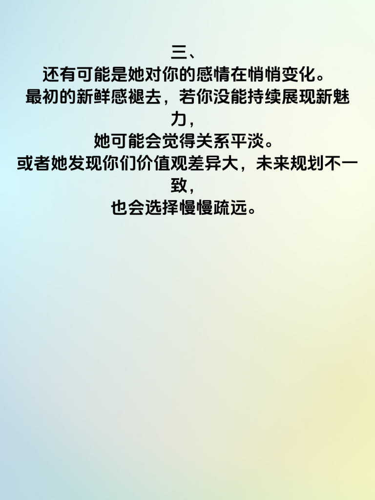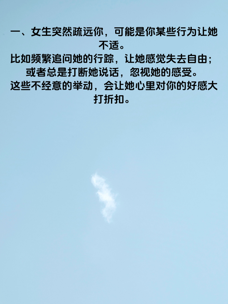 一、女生突然疏远你,可能是你某些行为让她不适。比如频繁追问她的行踪,让她感觉失去自由;或者总是打断她说话,忽视她的感受。这些不经意的举动,会让她心里对你的好感大打折扣。 二、她的生活节奏改变也会导致疏远。比如工作压力增大,需要全心投入,这时你的关心可能就成了她的负担。又或者她开始热衷于新爱好,社交圈变化,和你交流的时间自然减少。 三、还有可能是她对你的感情在悄悄变化。最初的新鲜感褪去,若你没能持续展现新魅力,她可能会觉得关系平淡。或者她发现你们价值观差异大,未来规划不一致,也会选择慢慢疏远。 四、面对女生的疏远,别慌张。先反思自己近期行为有无不妥,真诚地和她沟通,询问原因。若因她生活变化,给她空间,等她状态好时再关心。若感情问题,努力提升自己,展示新优点,重新吸引她。