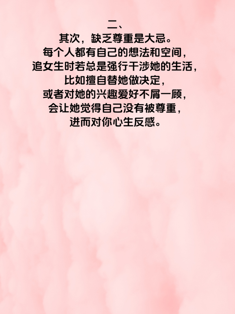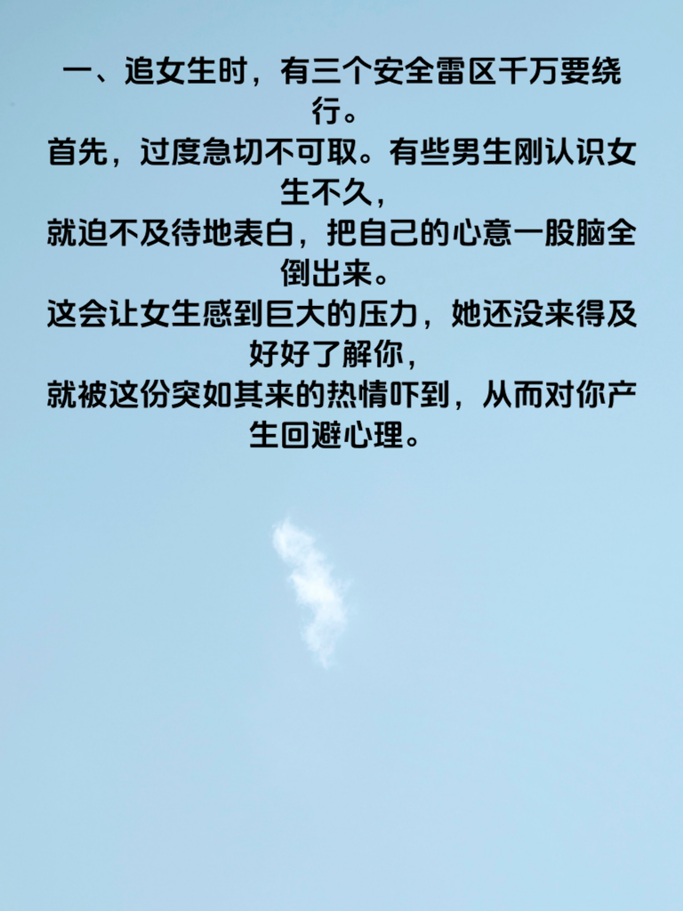 一、追女生时,有三个安全雷区千万要绕行。首先,过度急切不可取。有些男生刚认识女生不久,就迫不及待地表白,把自己的心意一股脑全倒出来。这会让女生感到巨大的压力,她还没来得及好好了解你,就被这份突如其来的热情吓到,从而对你产生回避心理。 二、其次,缺乏尊重是大忌。每个人都有自己的想法和空间,追女生时若总是强行干涉她的生活,比如擅自替她做决定,或者对她的兴趣爱好不屑一顾,会让她觉得自己没有被尊重,进而对你心生反感。 三、再者,一味讨好也并非良策。为了迎合女生,不断降低自己的底线,无条件满足她的要求,这样只会让女生看轻你。真正健康的关系是建立在平等和相互尊重基础上的,你应该展现出自己的个性和魅力,而不是一味地讨好。记住避开这三个雷区,用正确的方式去追求女生,才能增加成功的几率,收获美好的爱情。