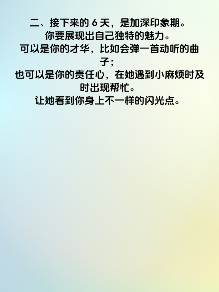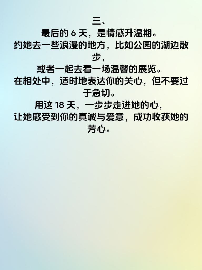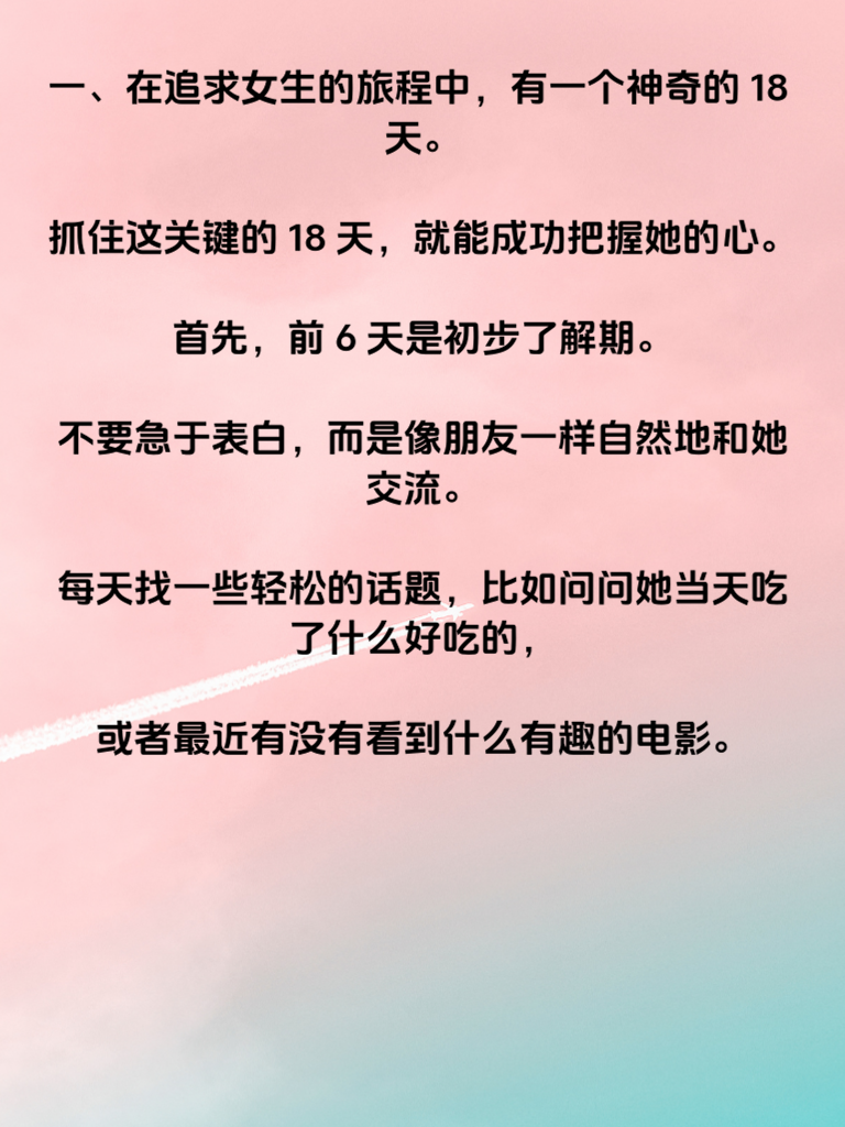 一、在追求女生的旅程中,有一个神奇的 18 天。抓住这关键的 18 天,就能成功把握她的心。首先,前 6 天是初步了解期。不要急于表白,而是像朋友一样自然地和她交流。每天找一些轻松的话题,比如问问她当天吃了什么好吃的,或者最近有没有看到什么有趣的电影。 二、接下来的 6 天,是加深印象期。你要展现出自己独特的魅力。可以是你的才华,比如会弹一首动听的曲子;也可以是你的责任心,在她遇到小麻烦时及时出现帮忙。让她看到你身上不一样的闪光点。 三、最后的 6 天,是情感升温期。约她去一些浪漫的地方,比如公园的湖边散步,或者一起去看一场温馨的展览。在相处中,适时地表达你的关心,但不要过于急切。用这 18 天,一步步走进她的心,让她感受到你的真诚与爱意,成功收获她的芳心。