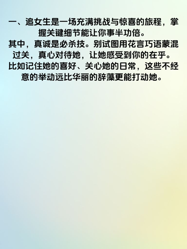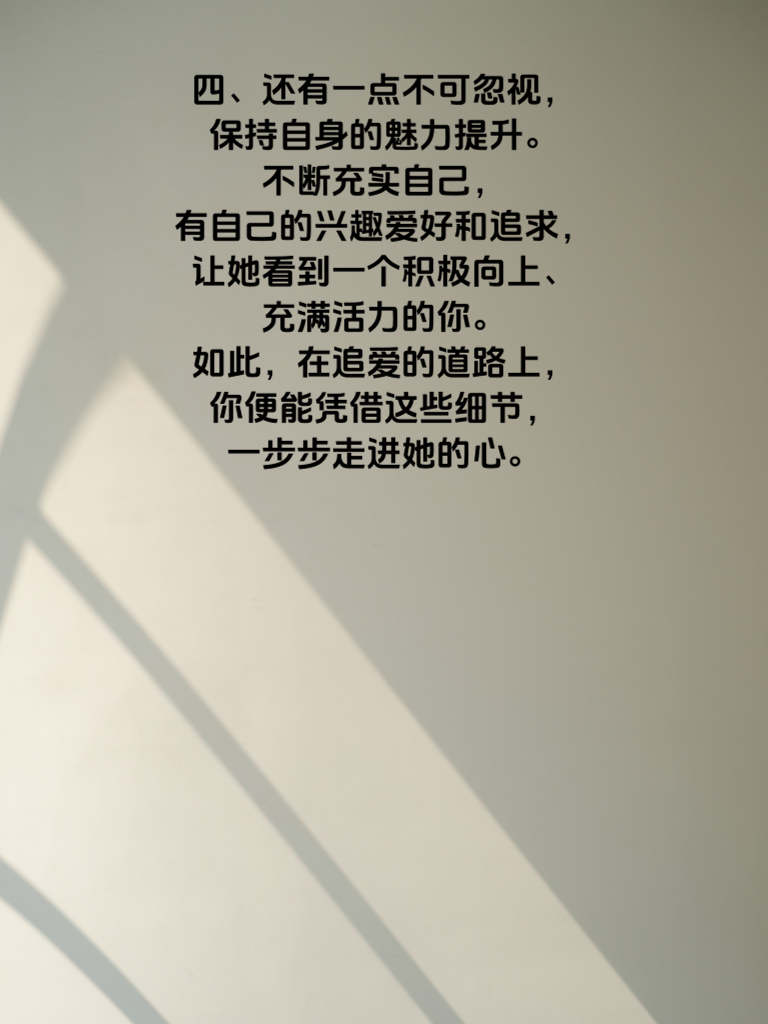 一、追女生是一场充满挑战与惊喜的旅程,掌握关键细节能让你事半功倍。其中,真诚是必杀技。别试图用花言巧语蒙混过关,真心对待她,让她感受到你的在乎。比如记住她的喜好、关心她的日常,这些不经意的举动远比华丽的辞藻更能打动她。 二、注重细节之处尽显爱意。约会时提前规划好行程,准时到达,展现你的靠谱。为她拉椅子、开车门,这些小绅士行为会让她心里暖暖的。聊天时专注倾听,适当给出回应,让她知道她的想法被珍视。 三、制造专属的浪漫瞬间也很重要。可以在她工作疲惫时,送上一杯亲手做的咖啡;在特殊的日子,精心准备一份有心意的礼物。不需要多贵重,关键是这份独一无二的用心,能让她在心底为你种下爱的种子。 四、还有一点不可忽视,保持自身的魅力提升。不断充实自己,有自己的兴趣爱好和追求,让她看到一个积极向上、充满活力的你。如此,在追爱的道路上,你便能凭借这些细节,一步步走进她的心。