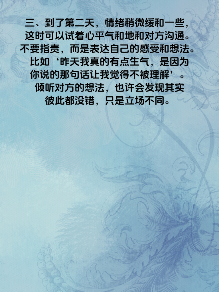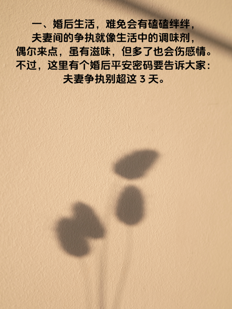 一、婚后生活,难免会有磕磕绊绊,夫妻间的争执就像生活中的调味剂,偶尔来点,虽有滋味,但多了也会伤感情。不过,这里有个婚后平安密码要告诉大家:夫妻争执别超这3天。 二、争执后的第一天,双方都在气头上,情绪激动,很容易说出伤人的话。所以这一天,先让自己冷静下来,别急于去理论。可以找个安静的角落,比如自己的房间,戴上耳机听听舒缓的音乐,或者出去散散步,吹吹风,让心情平复。 三、到了第二天,情绪稍微缓和一些,这时可以试着心平气和地和对方沟通。不要指责,而是表达自己的感受和想法。比如‘昨天我真的有点生气,是因为你说的那句话让我觉得不被理解’。倾听对方的想法,也许会发现其实彼此都没错,只是立场不同。 四、第三天,就是化解矛盾的时候了。一起回忆争执的起因,互相道歉,给对方一个拥抱。经过这三天的缓冲,感情会更加深厚,也能避免因长期争执而产生更大的裂痕,让婚姻生活更加和谐美满。