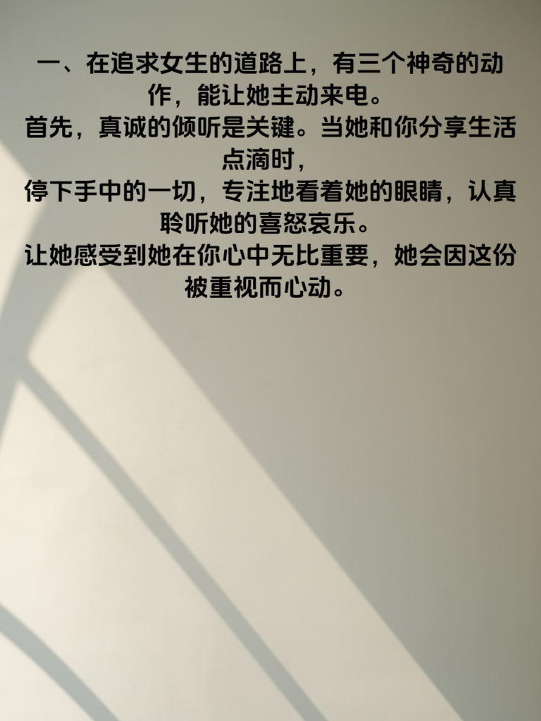 一、在追求女生的道路上,有三个神奇的动作,能让她主动来电。首先,真诚的倾听是关键。当她和你分享生活点滴时,停下手中的一切,专注地看着她的眼睛,认真聆听她的喜怒哀乐。让她感受到她在你心中无比重要,她会因这份被重视而心动。 二、不经意间的贴心关怀小动作也极具杀伤力。比如在寒冷的日子,递上一杯温暖的奶茶;在她疲惫时,轻轻为她按摩一下肩膀。这些看似微不足道的举动,却能在她心底泛起层层温暖的涟漪,让她对你好感倍增。 三、还有恰到好处的幽默风趣。适时地开个小玩笑,用诙谐的语言化解尴尬或逗她开心。幽默能展现你的智慧与魅力,让她在与你相处时充满欢乐,不知不觉就被你深深吸引,主动向你靠近,开启一段美好的故事。