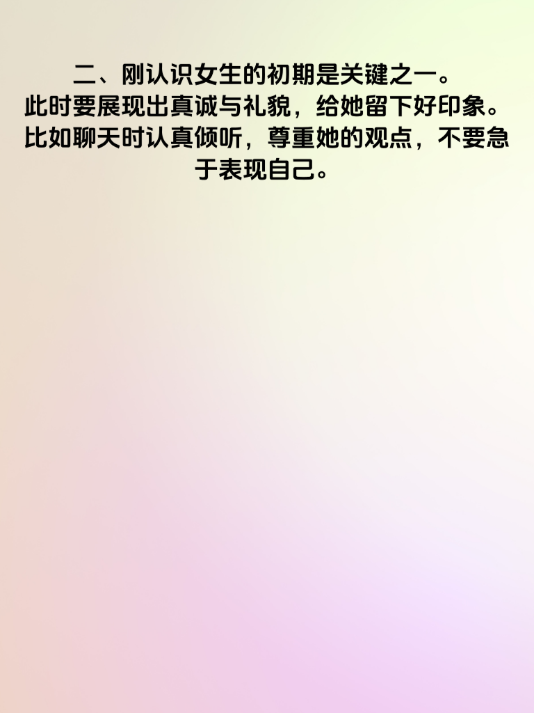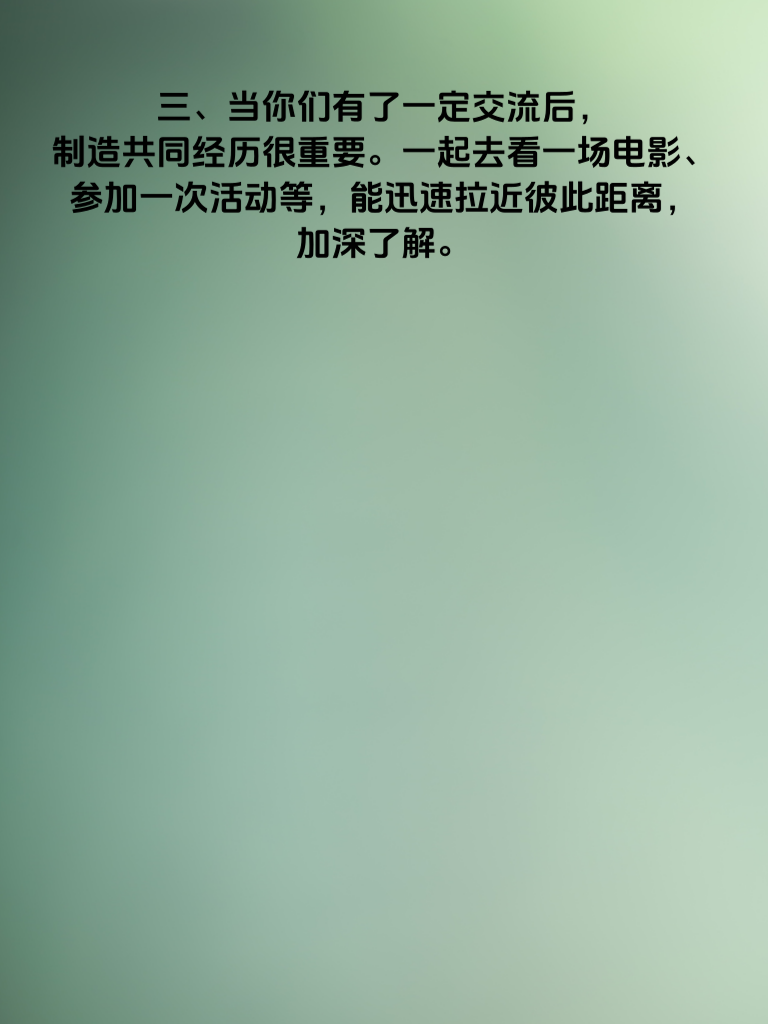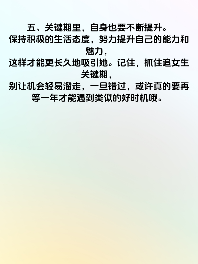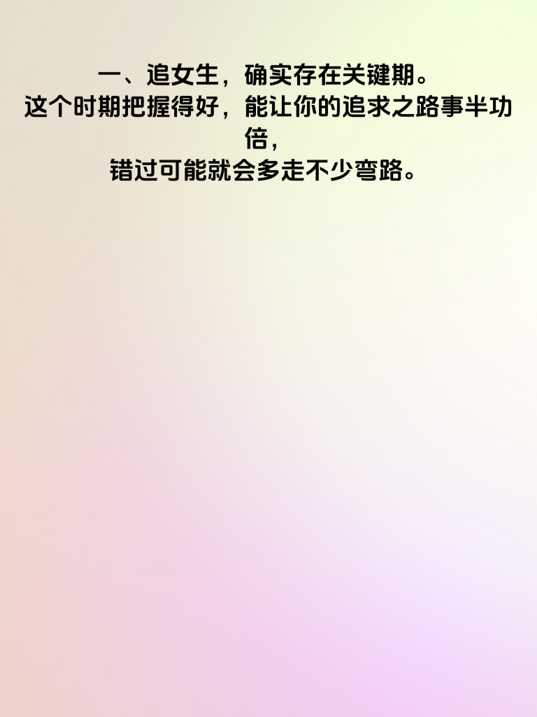 一、追女生,确实存在关键期。这个时期把握得好,能让你的追求之路事半功倍,错过可能就会多走不少弯路。 二、刚认识女生的初期是关键之一。此时要展现出真诚与礼貌,给她留下好印象。比如聊天时认真倾听,尊重她的观点,不要急于表现自己。 三、当你们有了一定交流后,制造共同经历很重要。一起去看一场电影、参加一次活动等,能迅速拉近彼此距离,加深了解。 四、还有她情绪低落或者取得成就时,这也是关键节点。在她难过时给予安慰,在她开心时真诚祝贺,让她感受到你的贴心。 五、关键期里,自身也要不断提升。保持积极的生活态度,努力提升自己的能力和魅力,这样才能更长久地吸引她。记住,抓住追女生关键期,别让机会轻易溜走,一旦错过,或许真的要再等一年才能遇到类似的好时机哦。
