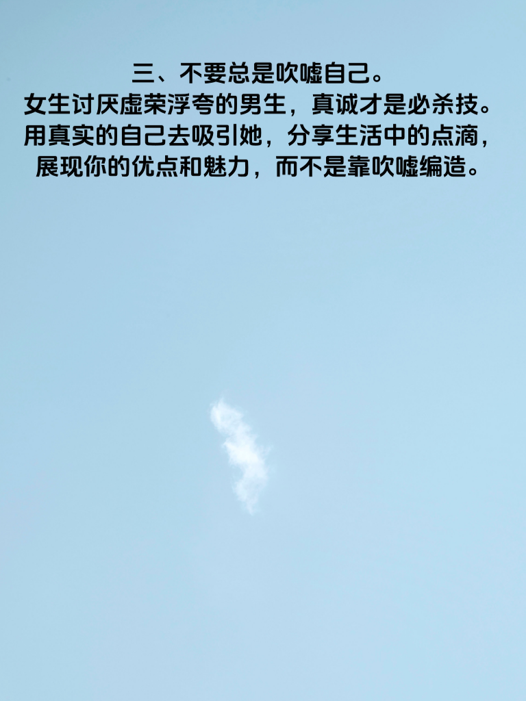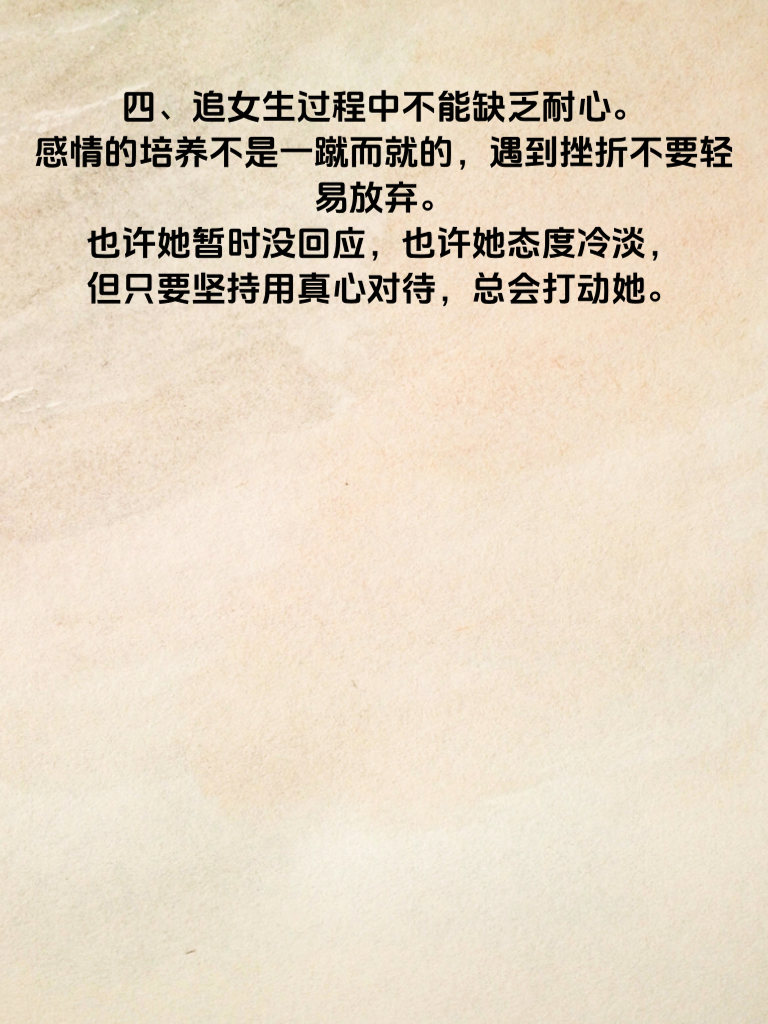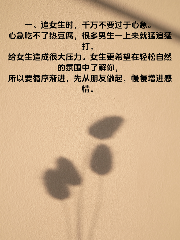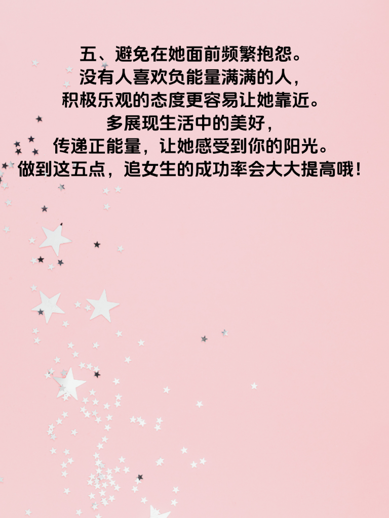 一、追女生时,千万不要过于心急。心急吃不了热豆腐,很多男生一上来就猛追猛打,给女生造成很大压力。女生更希望在轻松自然的氛围中了解你,所以要循序渐进,先从朋友做起,慢慢增进感情。 二、尊重她的个人空间也很关键。每个人都需要有自己的生活和圈子,不要试图过度干涉她。比如她和朋友聚会,不要一直追问行踪。给她自由,她会更欣赏你。 三、不要总是吹嘘自己。女生讨厌虚荣浮夸的男生,真诚才是必杀技。用真实的自己去吸引她,分享生活中的点滴,展现你的优点和魅力,而不是靠吹嘘编造。 四、追女生过程中不能缺乏耐心。感情的培养不是一蹴而就的,遇到挫折不要轻易放弃。也许她暂时没回应,也许她态度冷淡,但只要坚持用真心对待,总会打动她。 五、避免在她面前频繁抱怨。没有人喜欢负能量满满的人,积极乐观的态度更容易让她靠近。多展现生活中的美好,传递正能量,让她感受到你的阳光。做到这五点,追女生的成功率会大大提高哦!