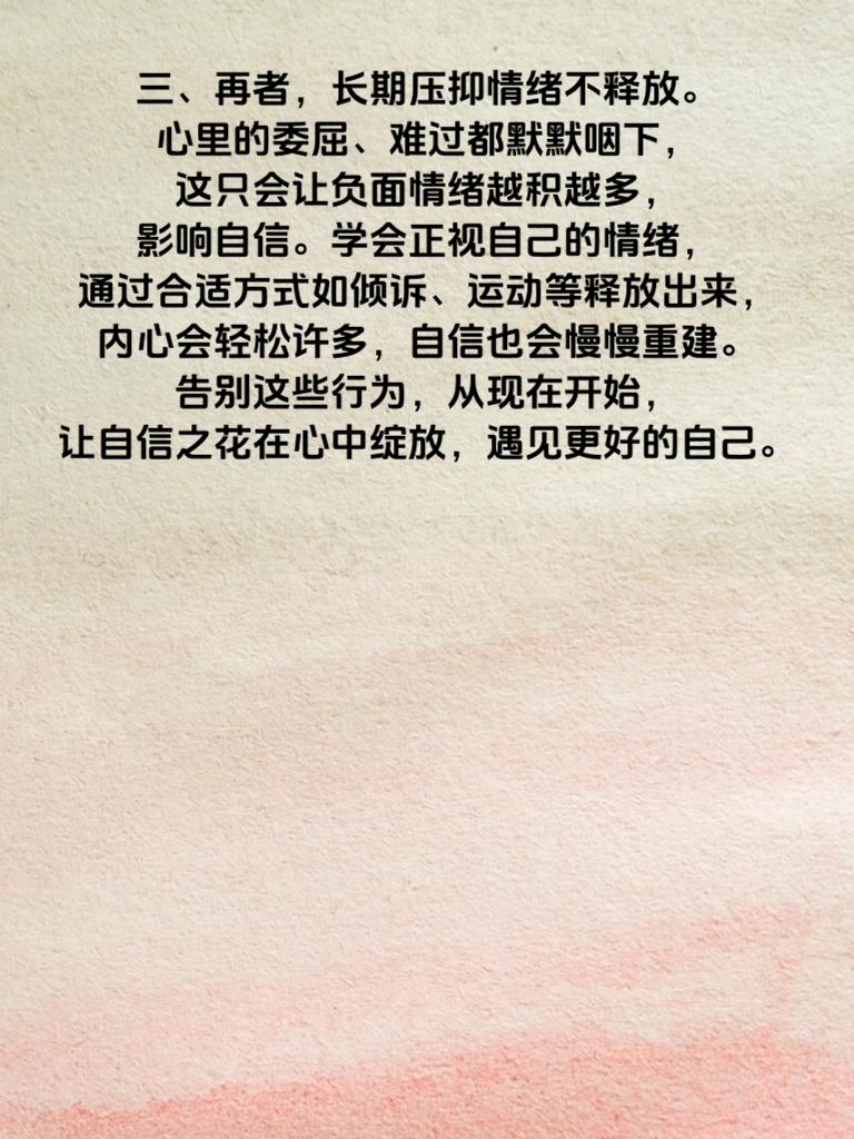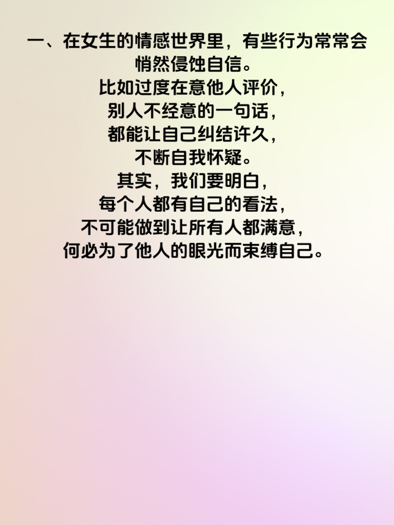 一、在女生的情感世界里,有些行为常常会悄然侵蚀自信。比如过度在意他人评价,别人不经意的一句话,都能让自己纠结许久,不断自我怀疑。其实,我们要明白,每个人都有自己的看法,不可能做到让所有人都满意,何必为了他人的眼光而束缚自己。 二、还有总是拿自己和他人盲目比较。看到别人在某方面比自己出色,就陷入焦虑。要知道,每个人都是独一无二的,有自己的闪光点和成长节奏。我们应专注自身优点,挖掘潜力,走出比较的怪圈。 三、再者,长期压抑情绪不释放。心里的委屈、难过都默默咽下,这只会让负面情绪越积越多,影响自信。学会正视自己的情绪,通过合适方式如倾诉、运动等释放出来,内心会轻松许多,自信也会慢慢重建。告别这些行为,从现在开始,让自信之花在心中绽放,遇见更好的自己。