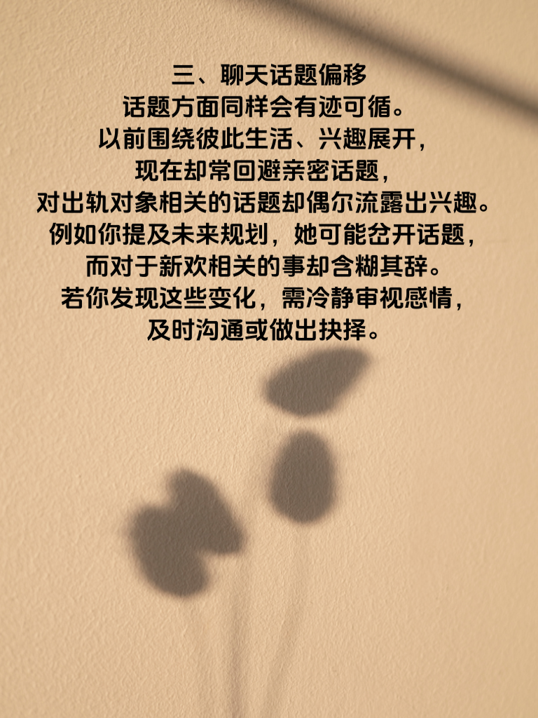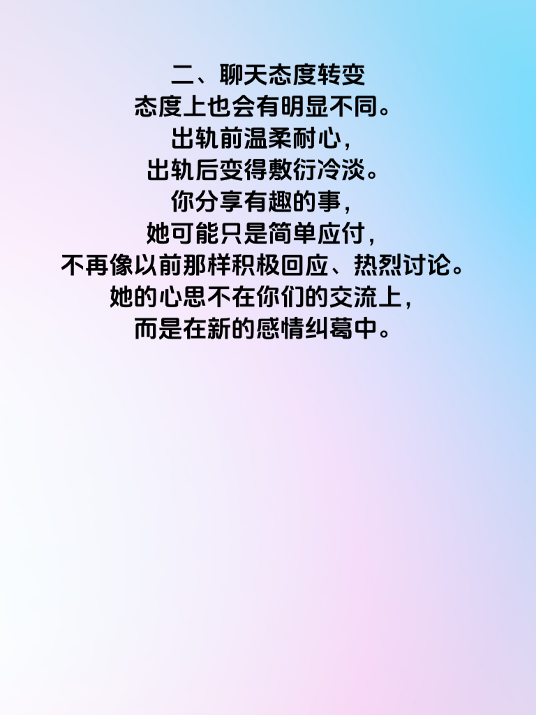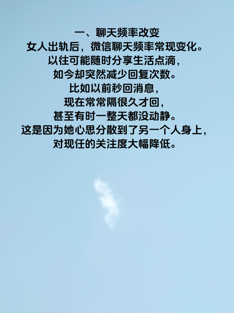 一、聊天频率改变\n女人出轨后,微信聊天频率常现变化。以往可能随时分享生活点滴,如今却突然减少回复次数。比如以前秒回消息,现在常常隔很久才回,甚至有时一整天都没动静。这是因为她心思分散到了另一个人身上,对现任的关注度大幅降低。 二、聊天态度转变\n态度上也会有明显不同。出轨前温柔耐心,出轨后变得敷衍冷淡。你分享有趣的事,她可能只是简单应付,不再像以前那样积极回应、热烈讨论。她的心思不在你们的交流上,而是在新的感情纠葛中。 三、聊天话题偏移\n话题方面同样会有迹可循。以前围绕彼此生活、兴趣展开,现在却常回避亲密话题,对出轨对象相关的话题却偶尔流露出兴趣。例如你提及未来规划,她可能岔开话题,而对于新欢相关的事却含糊其辞。若你发现这些变化,需冷静审视感情,及时沟通或做出抉择。