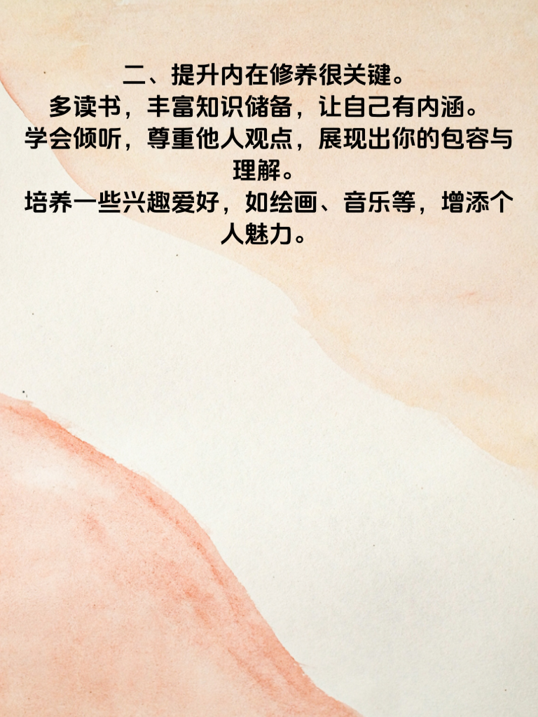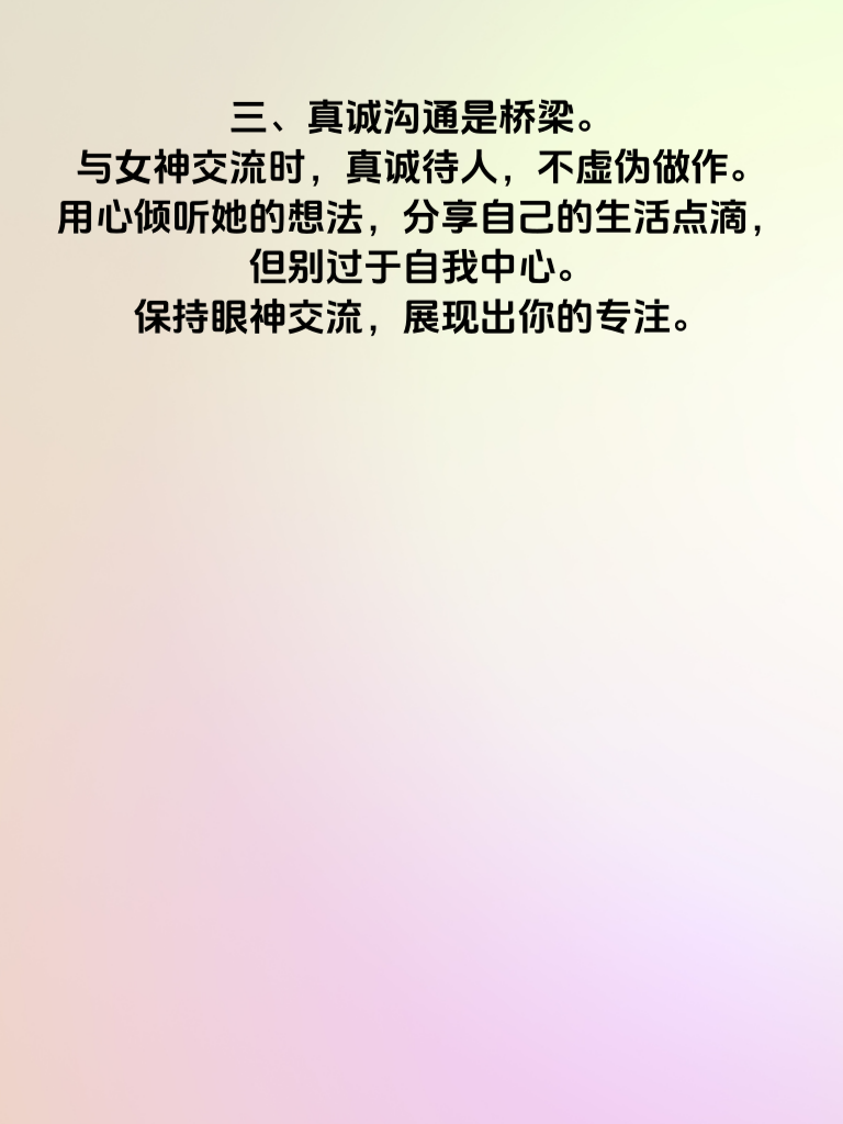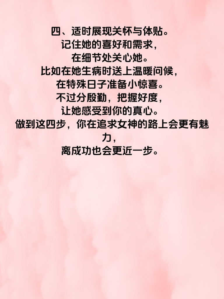一、形象塑造是敲门砖。保持干净整洁,穿着得体,展现出你的品味。注意个人卫生,打理好发型,选择适合自己风格的服装,这能让你在女神面前留下良好的第一印象。 二、提升内在修养很关键。多读书,丰富知识储备,让自己有内涵。学会倾听,尊重他人观点,展现出你的包容与理解。培养一些兴趣爱好,如绘画、音乐等,增添个人魅力。 三、真诚沟通是桥梁。与女神交流时,真诚待人,不虚伪做作。用心倾听她的想法,分享自己的生活点滴,但别过于自我中心。保持眼神交流,展现出你的专注。 四、适时展现关怀与体贴。记住她的喜好和需求,在细节处关心她。比如在她生病时送上温暖问候,在特殊日子准备小惊喜。不过分殷勤,把握好度,让她感受到你的真心。做到这四步,你在追求女神的路上会更有魅力,离成功也会更近一步。