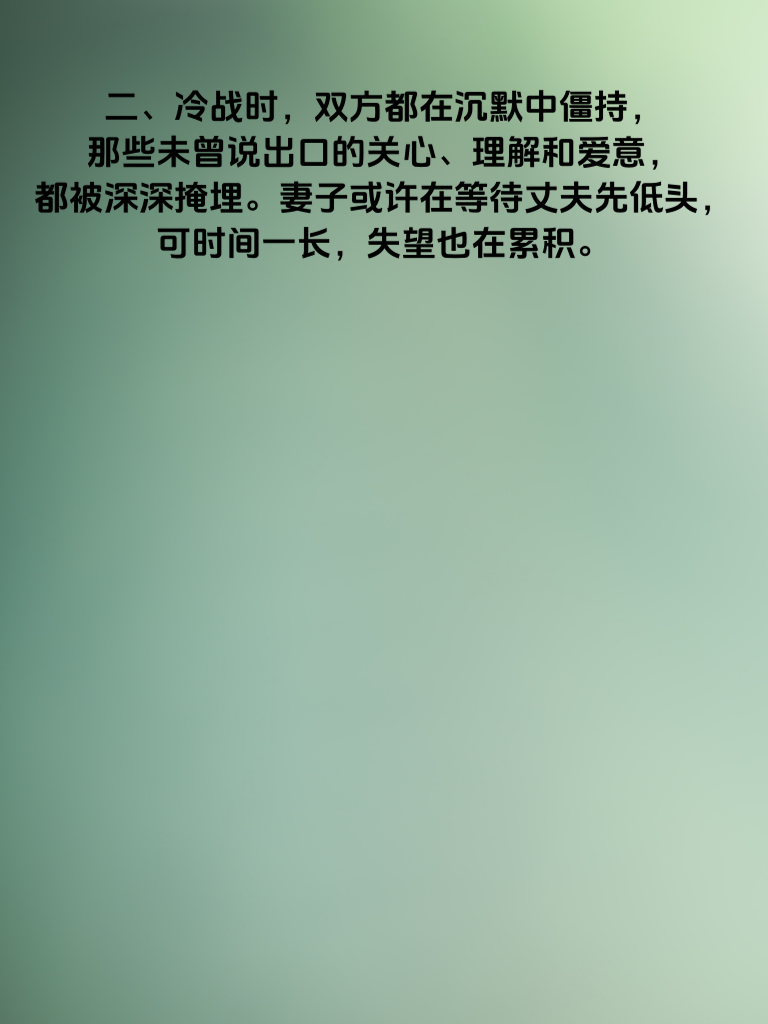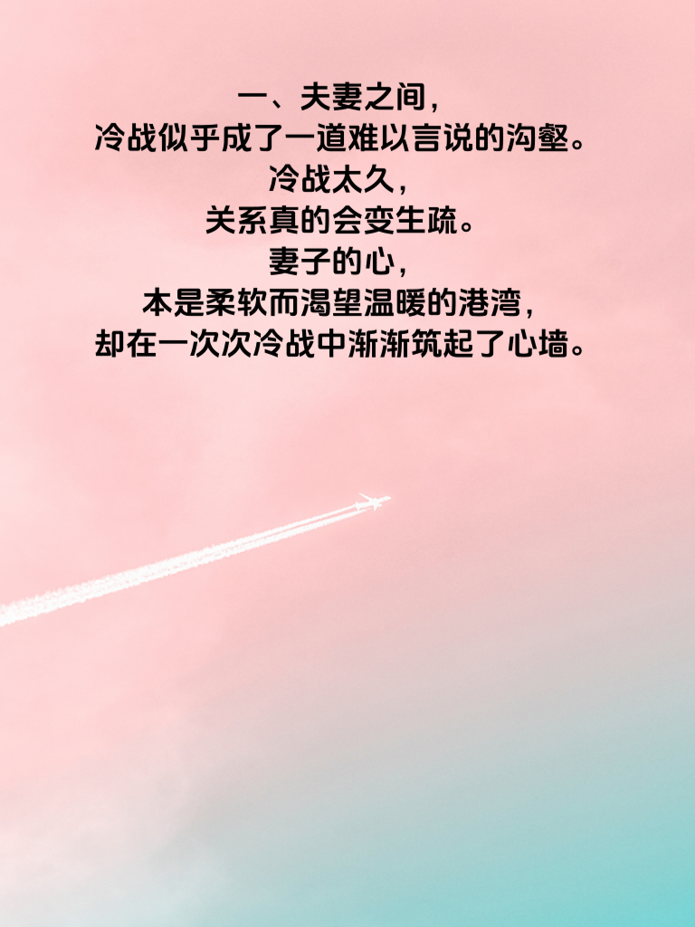 一、夫妻之间,冷战似乎成了一道难以言说的沟壑。冷战太久,关系真的会变生疏。妻子的心,本是柔软而渴望温暖的港湾,却在一次次冷战中渐渐筑起了心墙。 二、冷战时,双方都在沉默中僵持,那些未曾说出口的关心、理解和爱意,都被深深掩埋。妻子或许在等待丈夫先低头,可时间一长,失望也在累积。 三、作为丈夫,要明白妻子冷战背后的心理。她可能是在气头上,渴望你能主动沟通,解开矛盾。这时,放下身段,真诚地去交流,是修复关系的关键。 四、主动打破冷战的僵局,不要害怕先开口。一句温柔的道歉,一个温暖的拥抱,都能融化妻子心中的坚冰。重新找回曾经的亲密与默契,让关系不再生疏。 五、记住,婚姻中的冷战是感情的杀手,及时化解,用心经营,才能让妻子始终感受到你的爱,让你们的关系长久甜蜜。
