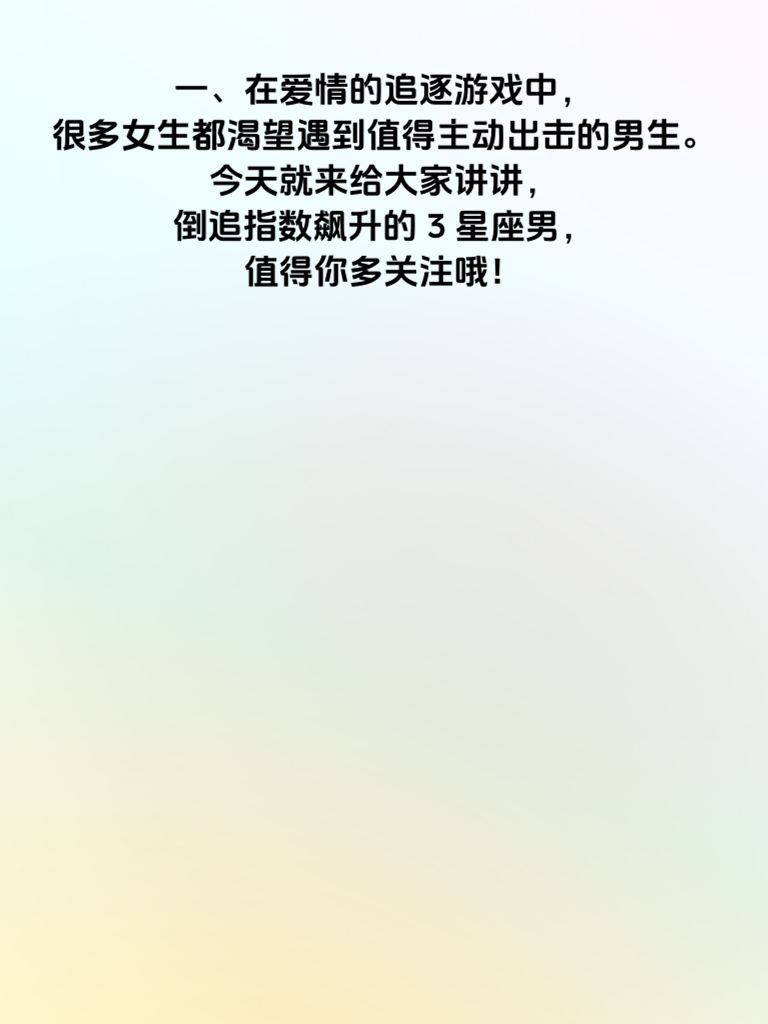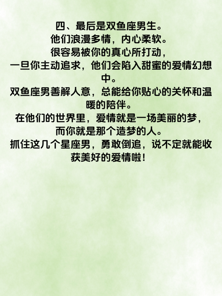 一、在爱情的追逐游戏中,很多女生都渴望遇到值得主动出击的男生。今天就来给大家讲讲,倒追指数飙升的3星座男,值得你多关注哦! 二、首先是天秤座男生。他们天生优雅迷人,有着超高的情商。对待感情细腻且温柔,总是能敏锐地察觉到你的情绪变化。如果你主动靠近,他们会热情回应,和你展开浪漫的互动。天秤座男很注重平衡与和谐,在感情里也会努力营造美好的氛围,让你时刻感受到被珍视。 三、接着是射手座男生。他们性格开朗乐观,充满活力。当你倒追他们时,会被他们的热情所感染,一起踏上充满冒险与惊喜的旅程。射手座男真诚坦率,不会隐藏自己的想法,能给你满满的安全感。而且他们热爱自由,也会尊重你的空间,和他们在一起,爱情会变得轻松又有趣。 四、最后是双鱼座男生。他们浪漫多情,内心柔软。很容易被你的真心所打动,一旦你主动追求,他们会陷入甜蜜的爱情幻想中。双鱼座男善解人意,总能给你贴心的关怀和温暖的陪伴。在他们的世界里,爱情就是一场美丽的梦,而你就是那个造梦的人。抓住这几个星座男,勇敢倒追,说不定就能收获美好的爱情啦!