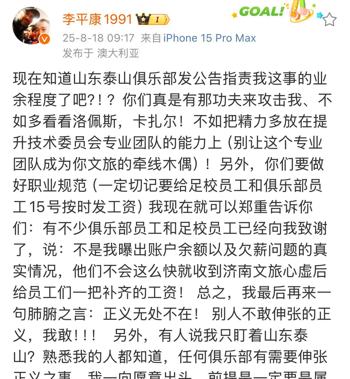 媒体人李平康今天怼了山东泰山俱乐部。他表示自己的判断没有错,卡扎尔和洛佩斯的实力都很一般,因此山东泰山的引援团队要承担责任。 李平康也透露,许多山东泰山俱乐部的员工感谢他,因为这些员工的工资按时发放了。李平康坦然,自己伸张了正义。