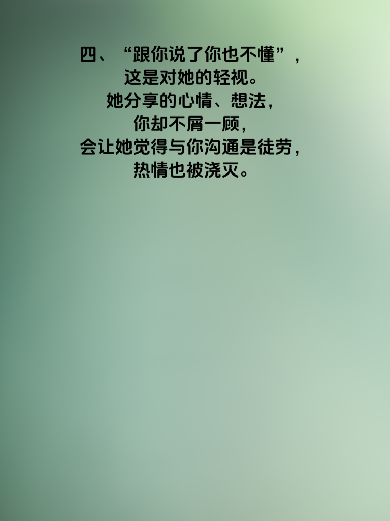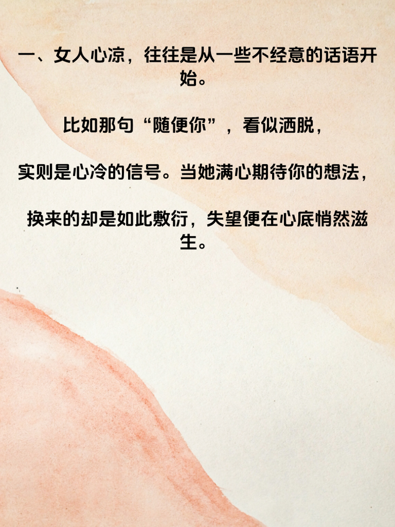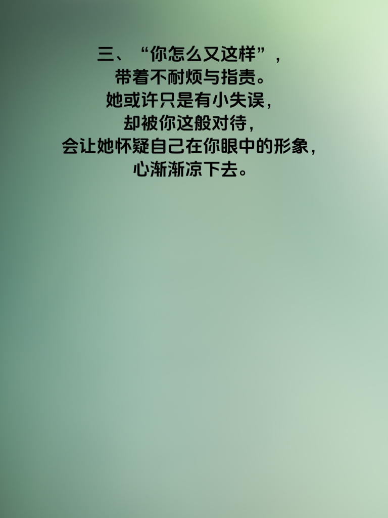 一、女人心凉,往往是从一些不经意的话语开始。比如那句“随便你”,看似洒脱,实则是心冷的信号。当她满心期待你的想法,换来的却是如此敷衍,失望便在心底悄然滋生。 二、“我很忙”这句话,也常是心凉的前奏。她渴望陪伴,而你却总用忙碌推开她,一次次的忙碌会让她觉得自己在你心里并不重要。 三、“你怎么又这样”,带着不耐烦与指责。她或许只是有小失误,却被你这般对待,会让她怀疑自己在你眼中的形象,心渐渐凉下去。 四、“跟你说了你也不懂”,这是对她的轻视。她分享的心情、想法,你却不屑一顾,会让她觉得与你沟通是徒劳,热情也被浇灭。 五、所以,男生们要注意,别让这些话轻易出口。多些耐心倾听,多些温柔回应,用心去呵护她的感受,才能让她的心始终温暖,感情长久甜蜜。