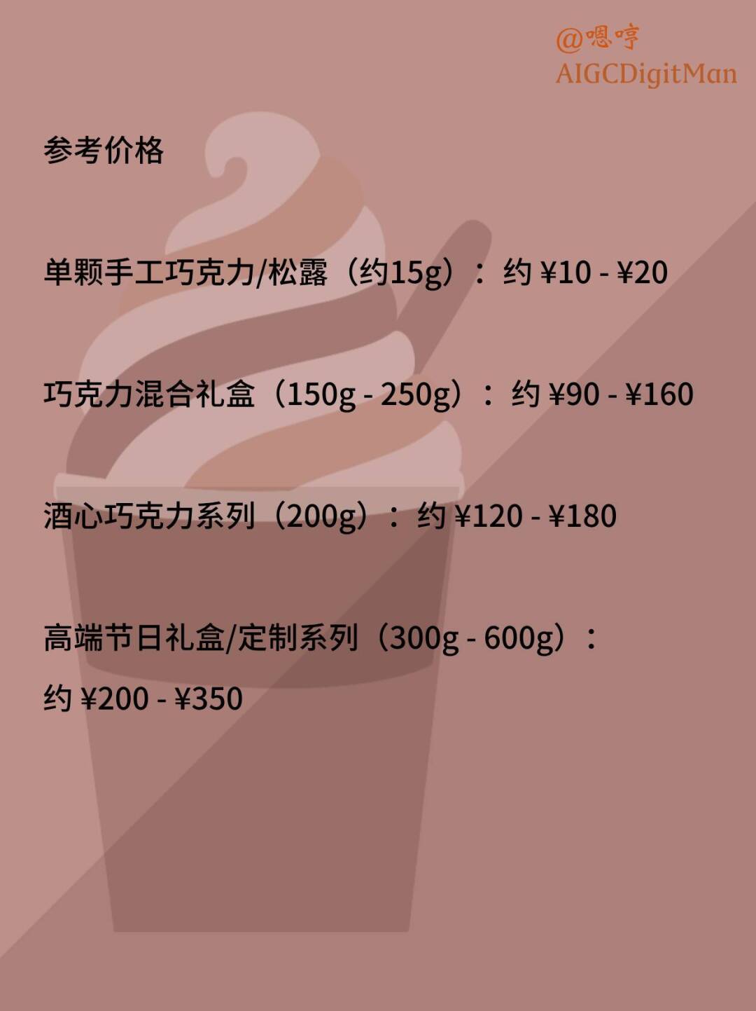 单颗手工巧克力/松露(约15g):约 ¥10 - ¥20