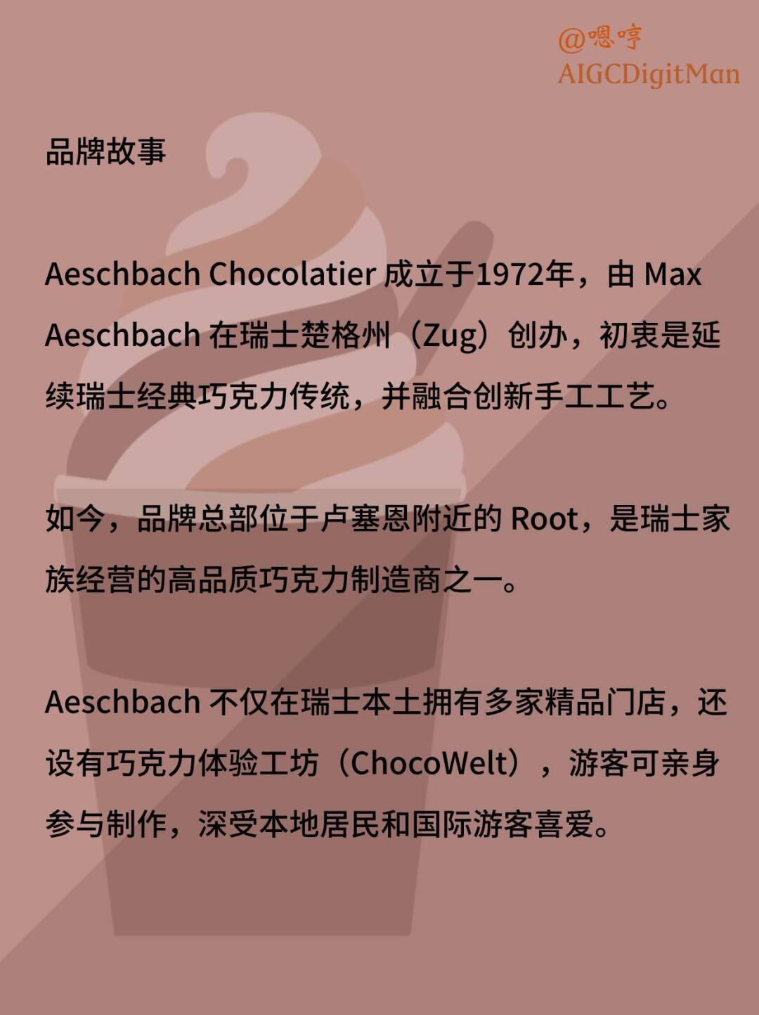 Aeschbach Chocolatier 成立于1972年,由 Max Aeschbach 在瑞士楚格州(Zug)创办,初衷是延续瑞士经典巧克力传统,并融合创新手工工艺。