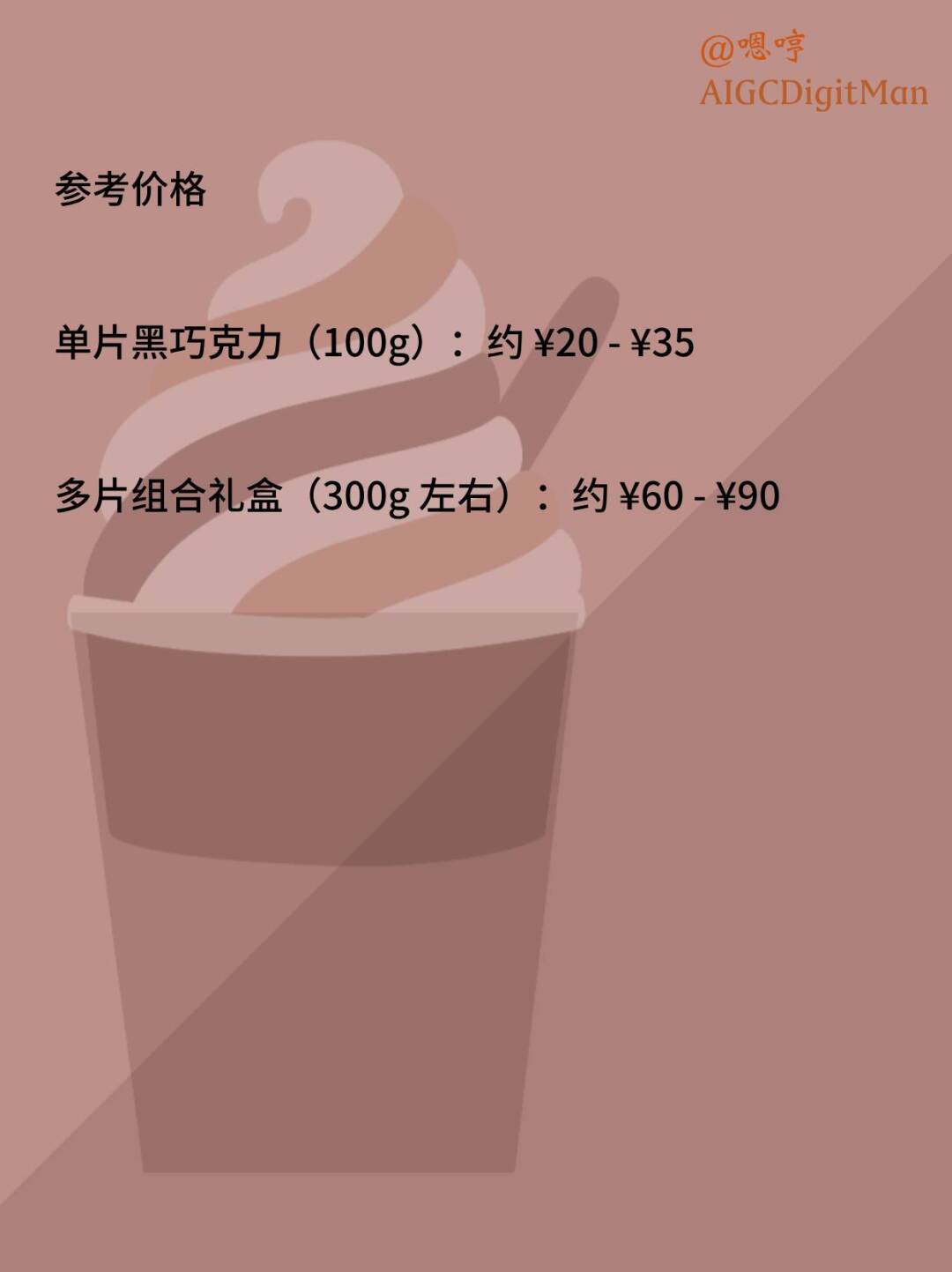 单片黑巧克力(100g):约 ¥20 - ¥35