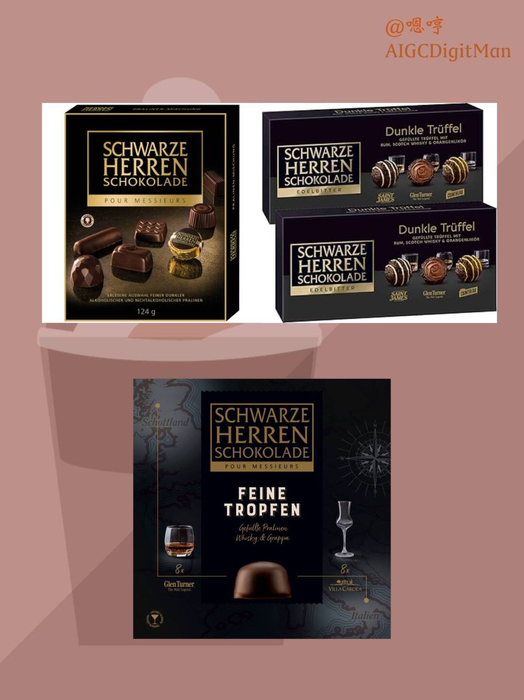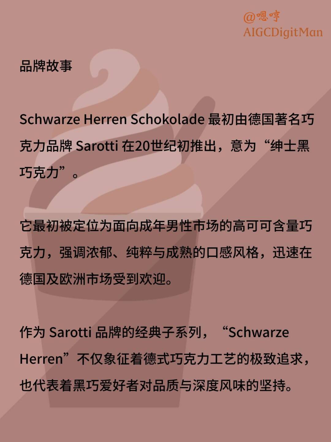 Schwarze Herren Schokolade 最初由德国著名巧克力品牌 Sarotti 在20世纪初推出,意为“绅士黑巧克力”。