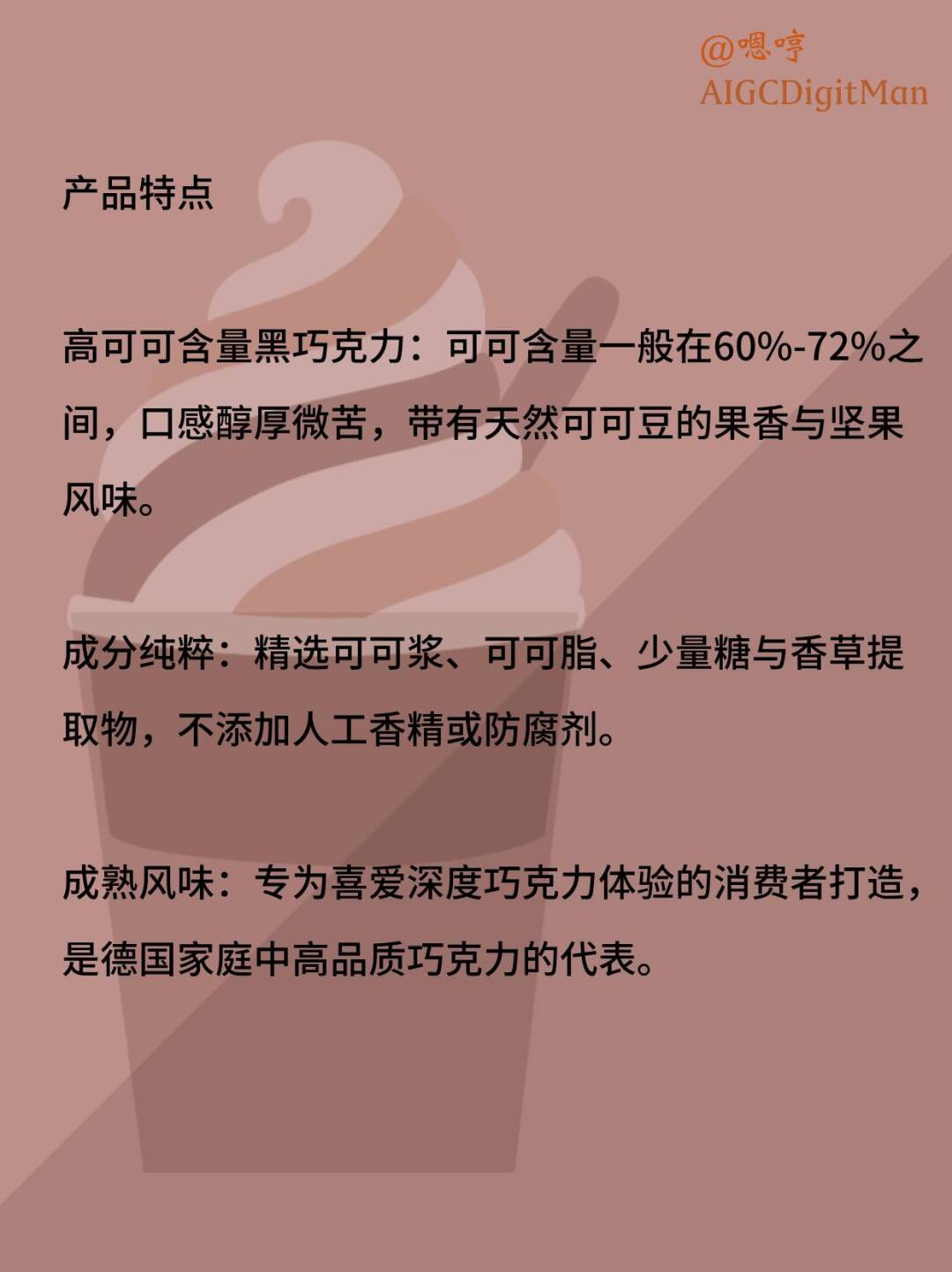 成分纯粹:精选可可浆、可可脂、少量糖与香草提取物,不添加人工香精或防腐剂。