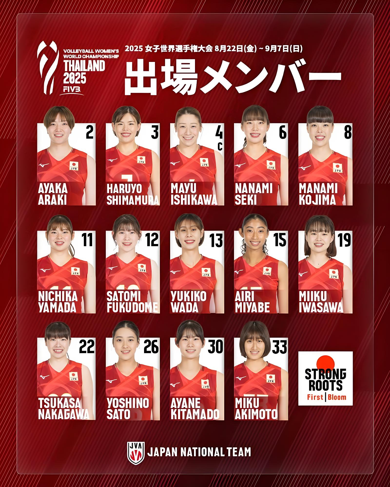 日本排协公布了参加2025泰国世锦赛的14人名单 边攻:4-石川真佑、13-和田由纪子、26-佐藤淑乃、30-北窓绚音、33-秋本美空 副攻:2-荒木彩花、3-岛村春世、11-山田二千华、15-宫部蓝梨 二传:6-关菜菜巳、22-中川つかさ 自由人:8-小岛满菜美、12-福留慧美、19-岩泽实育 日本自由人水平没必要带仨吧~ 樱东洋魔女分在最后一组H组 同组的有塞尔维亚、喀麦隆和乌克兰 首战 8月23日 18:00 对阵非洲雌狮喀麦隆!