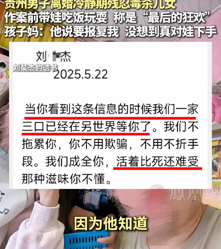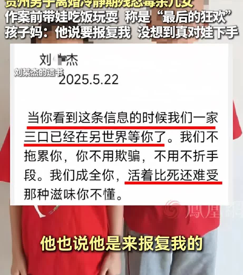 简直比动物还冷血,家暴男是不是都好极端?做你的子女犯了何罪? 今年5月22日,贵州遵义的男子刘某杰在离婚冷静期杀害自己10岁的儿子和7岁的女儿毒杀案,将于8月21日开庭审理。 刘某杰因对妻子实施家暴,且下死手,妻子不堪忍受提出离婚。然而在离婚冷静期,男子扬言要用毒杀孩子的手段来威胁妻子妥协,还拍摄视频称这是最后的狂欢。孩子的舅舅发现男子的遗书后报了警,等警察赶到现场时孩子已经中毒,送到医院抢救却已无济于事,而刘某杰自杀未遂入狱。 孩子舅舅称:姐姐因受不了姐夫家暴于5月17日提出离婚,5月21日,刘某杰拿农药威胁并捆绑她,扬言要毒杀她,她报警后才得以逃离。没想到5月22日姐夫就对俩孩子下手了。 “虎度尚且不食子”,看看这样的男人,该不该死?毒杀孩子就为要挟妻子妥协,真的无法理解这种自私的思维方式。 妻子表示到现在还接受不了孩子被男人杀害这个事实,看看很多自私的男人就是知道孩子是妻子心中的软肋,只有拿孩子才能要挟住妻子,发生过这么多男的杀害亲子案,真的没想到会有这么多狠心的男人。 做他的孩子可够倒霉的,活着的时候遭受他对妈妈的家暴,生活在毫无安宁的家庭环境中,这样的日子多么糟糕?生命的终结还是亲爹毒杀手段结束,他们倒下的那一刻,知道是他们的自私爹带去吃的最后一顿饭吗? 以后这种不合格的偏执暴力狂不要再结婚了,自私害人。