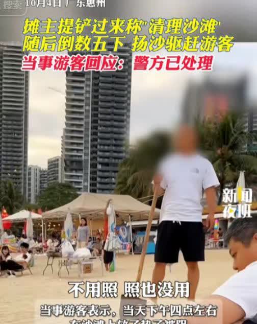 “惠州文旅一觉醒来,天都塌了!”女游客跟家人在公共沙滩休息,一名陌生男子手拿铁锹