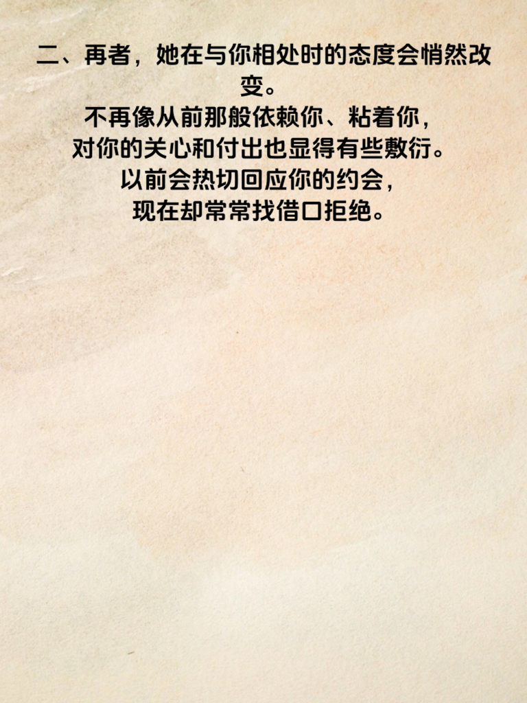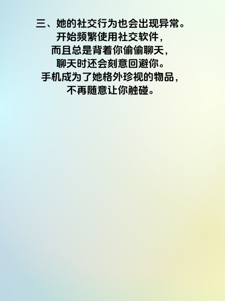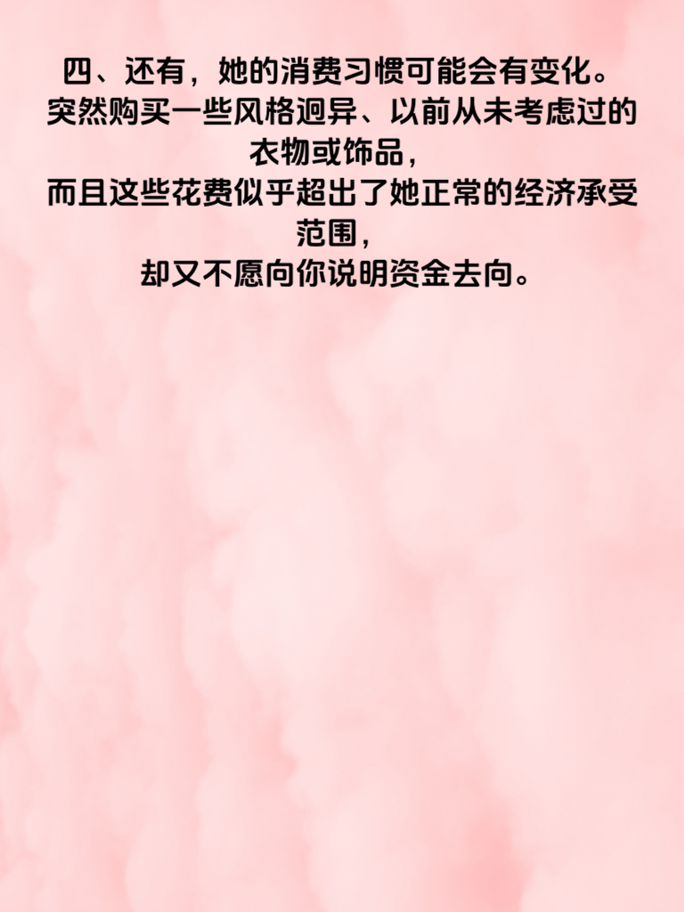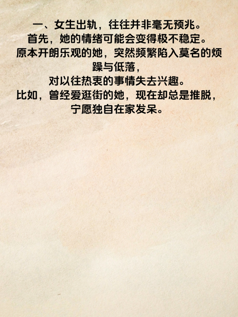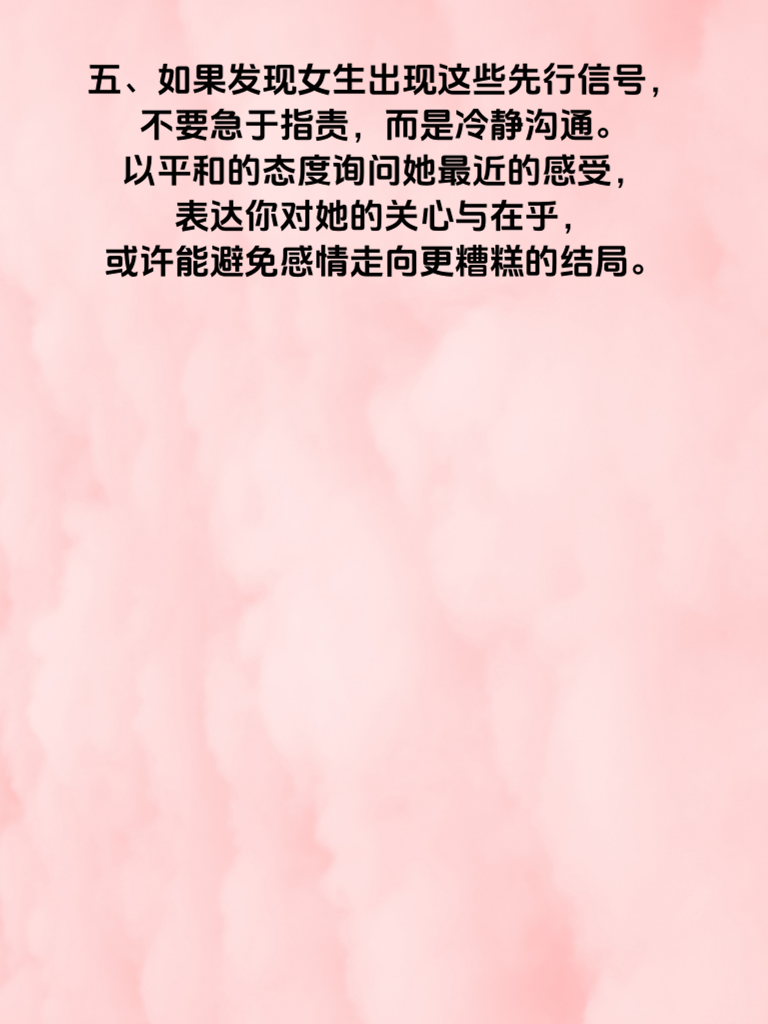 一、女生出轨,往往并非毫无预兆。首先,她的情绪可能会变得极不稳定。原本开朗乐观的她,突然频繁陷入莫名的烦躁与低落,对以往热衷的事情失去兴趣。比如,曾经爱逛街的她,现在却总是推脱,宁愿独自在家发呆。 二、再者,她在与你相处时的态度会悄然改变。不再像从前那般依赖你、粘着你,对你的关心和付出也显得有些敷衍。以前会热切回应你的约会,现在却常常找借口拒绝。 三、她的社交行为也会出现异常。开始频繁使用社交软件,而且总是背着你偷偷聊天,聊天时还会刻意回避你。手机成为了她格外珍视的物品,不再随意让你触碰。 四、还有,她的消费习惯可能会有变化。突然购买一些风格迥异、以前从未考虑过的衣物或饰品,而且这些花费似乎超出了她正常的经济承受范围,却又不愿向你说明资金去向。 五、如果发现女生出现这些先行信号,不要急于指责,而是冷静沟通。以平和的态度询问她最近的感受,表达你对她的关心与在乎,或许能避免感情走向更糟糕的结局。