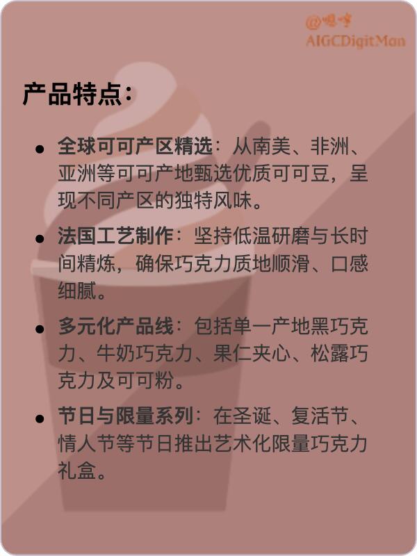 多元化产品线:包括单一产地黑巧克力、牛奶巧克力、果仁夹心、松露巧克力及可可粉。