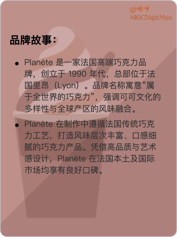 Planète 是一家法国高端巧克力品牌,创立于 1990 年代,总部位于法国里昂(Lyon)。