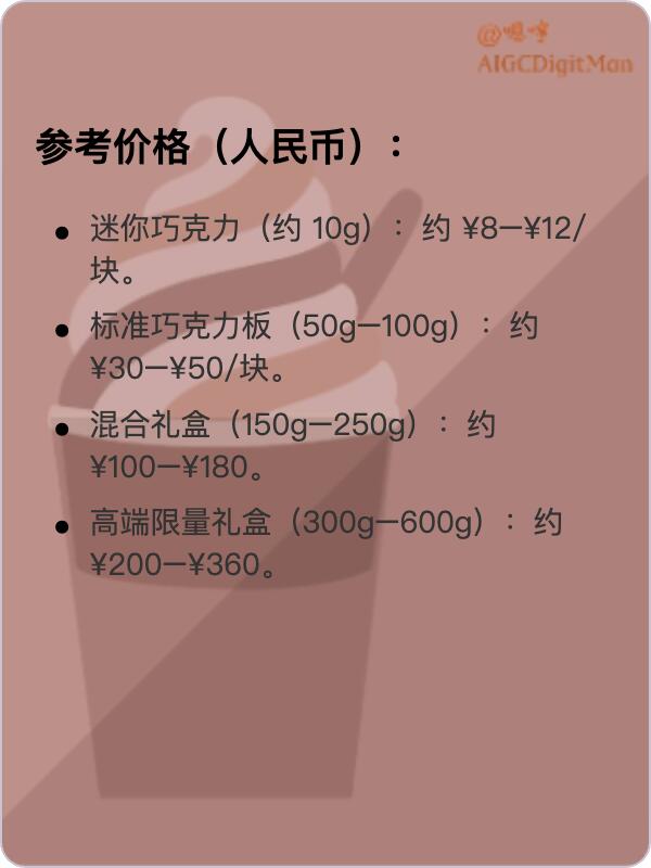 迷你巧克力(约 10g):约 ¥8–¥12/块。