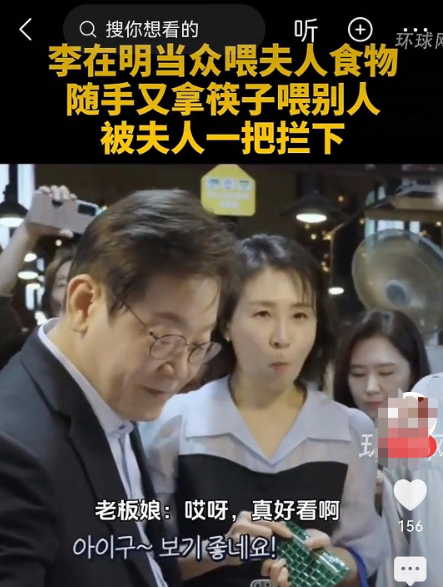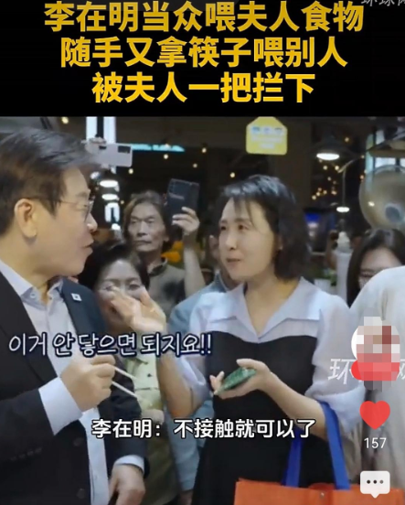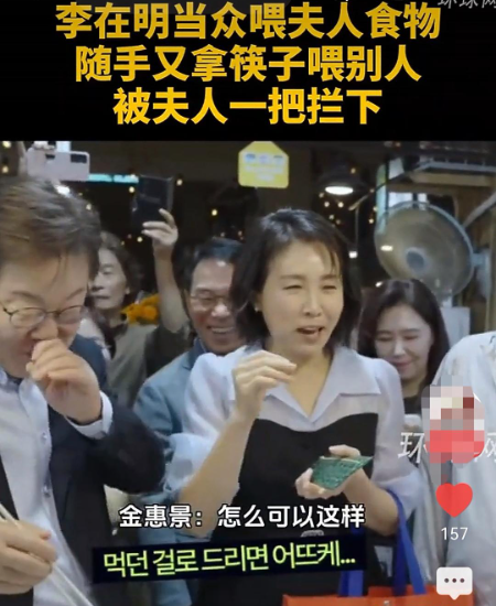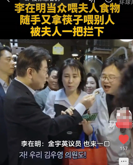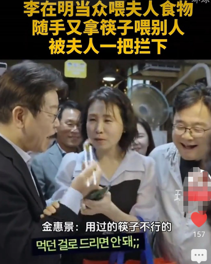 李在明当众用筷子喂夫人后,又随手拿同一双筷子喂议员,这一举动被其夫人及时拦下。