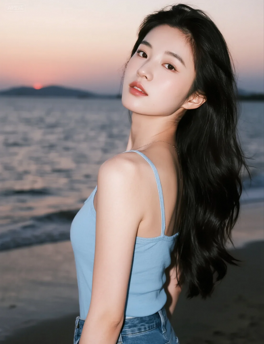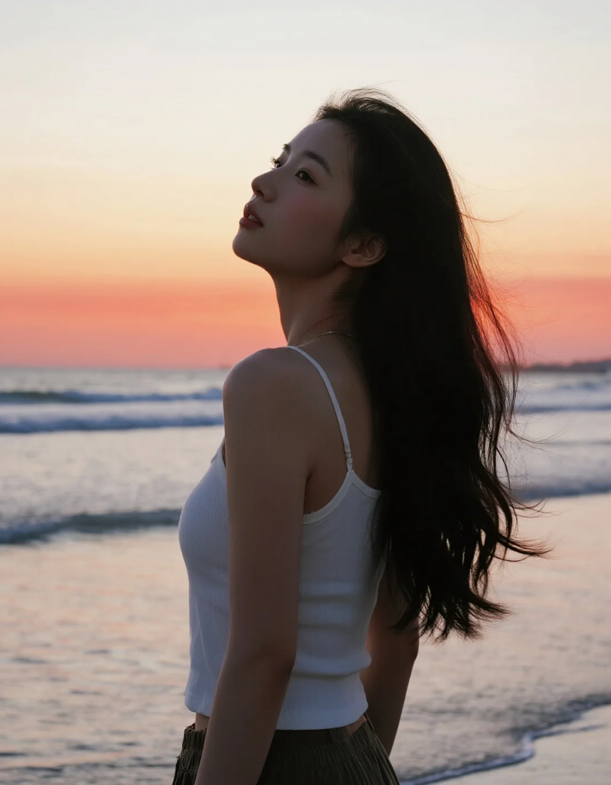沙滩长发女孩,晚风轻抚,笑容温柔而充满神秘