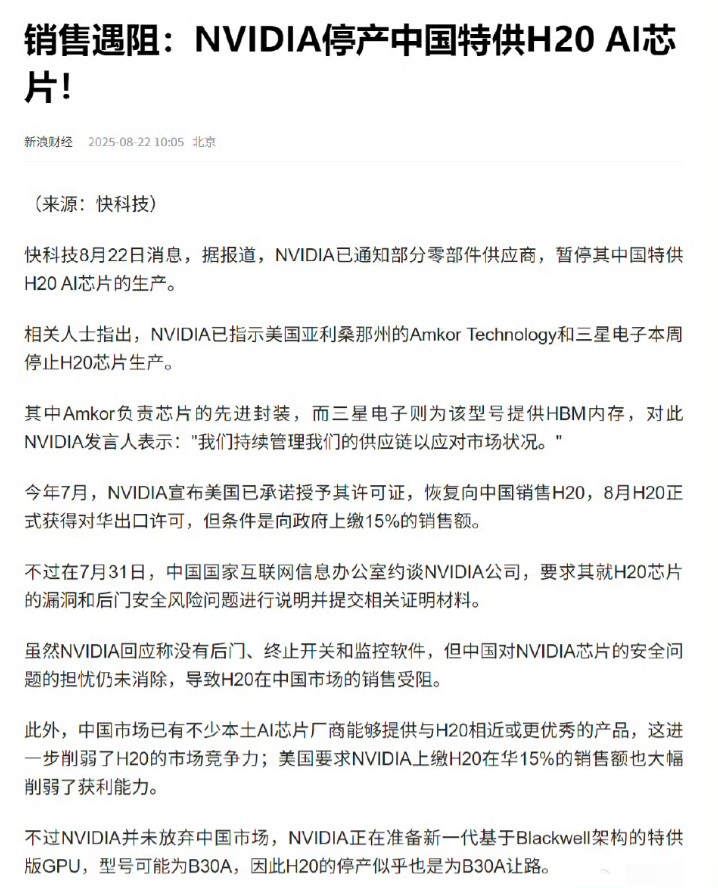 孙少军: 英伟达停产中国特供H20AI芯片,刚刚才来,怎么突然就停产了!