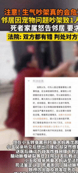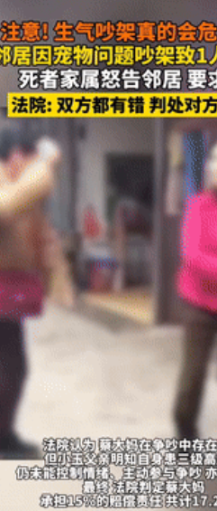 冤不冤!江苏无锡,一大妈路过邻居家时,被对方养的狗吓到了,于是就开始辱骂邻居,在两人争吵时,邻居父母也加入其中,不料,邻居父亲却因此被“气死”,事后,邻居将大妈告上法庭索赔,而法院这样判了! 据青岛新闻网8月21日的报道,在悲剧还没发生之前,大妈和邻居的关系就不太好,两人经常因为一些小事拌嘴。 这天,大妈准备外出办事时,刚好邻居也要外出去遛狗,然后狗就突然叫了声,给大妈惊着了。 就这样俩人开始吵架了,闹出的动静也把邻居父母给招来了,接着大妈就开始舌战群儒,一人说三个都不落下风。 直到有人选择报警,民警过来调解了后,双方才肯愿意停手,不过,就在邻居一家准备离开的时候,大妈又突然骂了几句。 而邻居的父亲就准备再次开启斗争,但是话还没来得及说出口,人就躺地上不省人事了,去医院救了2个月,还是没能挺过来。 至于原因就是情绪太激动,导致脑动脉瘤破裂,造成了脑出血以及其他的病症,事后,邻居就把大妈给把大妈起诉了,要求赔偿损失。 法院调查完情况后,就说邻居父亲明知道自己有高血压,还跑去和别人吵架,肯定是要负主责的,至于大妈的话,也有做的不对的地方,所以就判定她赔给邻居家17万就行了。 那么对于这件事情,您有什么想说的呢?