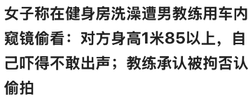 广东佛山,一女子在健身房健完身后,一丝不挂的在浴室冲凉,突然发现有人从门缝处用车内窥镜偷窥自己洗澡,女子很快从对方的鞋子和腿上辨认出,对方正是自己的健身教练。她震惊不已,却不敢声张,想着好汉不吃眼前亏,毕竟教练1米85的个头,真要干点什么,自己还真无力反抗。2天后,她报了警。警方认定教练侵犯女子隐私,处以4日的行政拘留。教练先是承认了,后又改口称自己是法盲,只是想早点回去开店,就承认了,会申请行政复议。