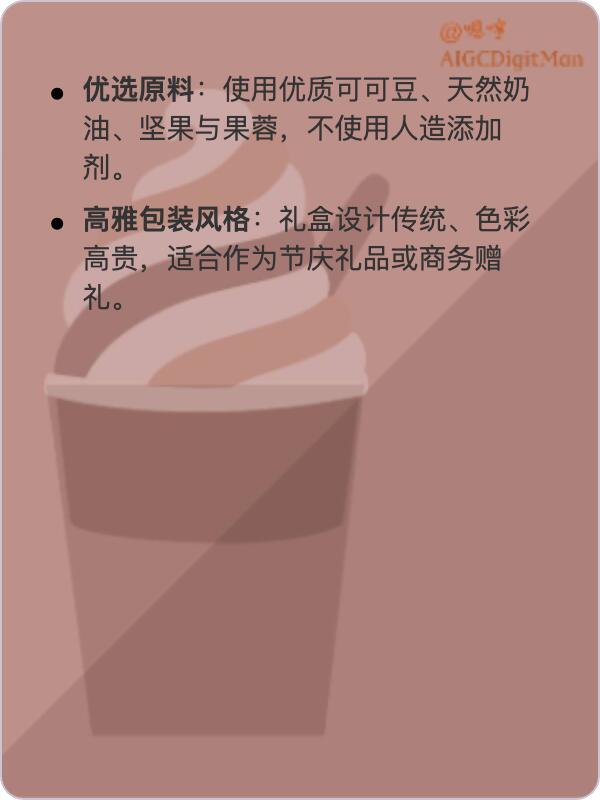 优选原料:使用优质可可豆、天然奶油、坚果与果蓉,不使用人造添加剂。